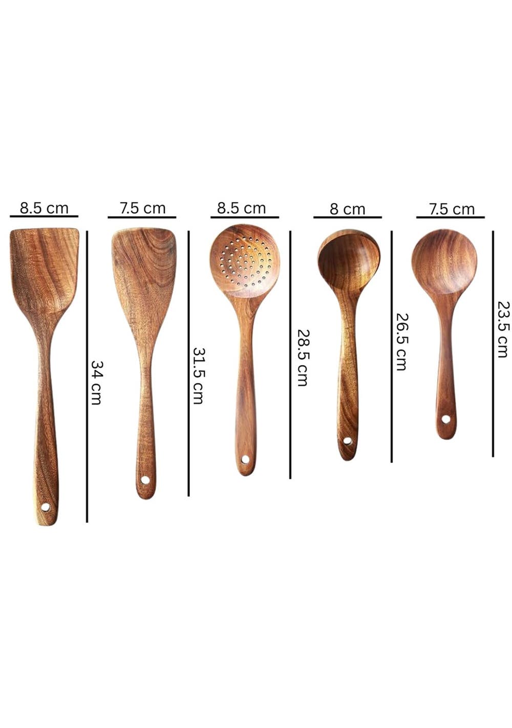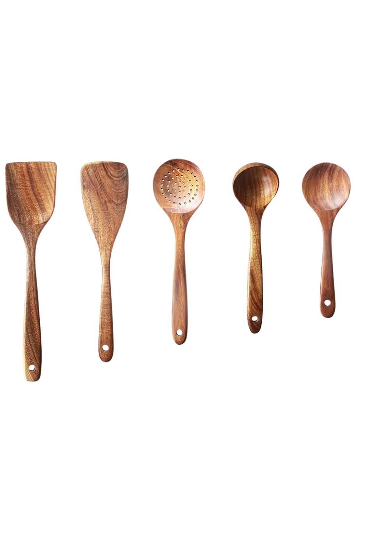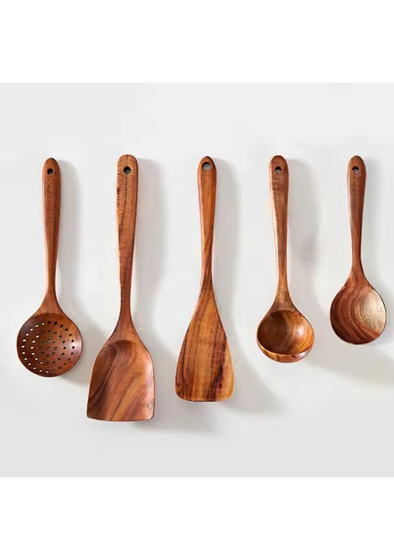 Crafted from close-grained teak with naturally high oil content, these utensils are highly durable and resistant to cracking or breaking. Whether you're stirring, flipping, or serving, this set provides reliable function with a timeless, rustic charm.Featuring a beautiful shape and a long handle, these tools are not only functional but also aesthetically pleasing. The delicate design makes them easy to grip, enhancing your cooking experience.These tools are safe for use on hot surfaces and compatible with various cooking surfaces, making them ideal for a wide range of culinary tasks in the kitchen or restaurant.With five stylish options available, these fancy kitchen tools make great gifts for yourself or friends. Their unique designs add a touch of elegance to any kitchen.Care for these tools is simple—just wash by hand with mild soap or water and store them in a dry place. This easy maintenance ensures they remain in excellent condition for long-term use.Product Specification:Material: WoodColor: BrownWooden Spatula Size: 8.5 x 34 cmFlat Spatula Size: 7.5 x 31.5 cmSlotted Spoon Size: 8.5 x 28.5 cmSoup Spoon Size: 8 x 26.5 cmRound Spoon Size: 7.5 x 23.5 cmWeight: 500gFunction: Kitchen Cooking ToolPackage Inclusion:1 x Wooden Spatula1 x Flat Spatula1 x Slotted Spoon1 x Soup Spoon1 x Round Spoon