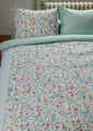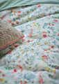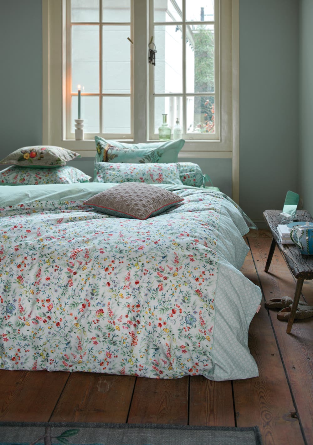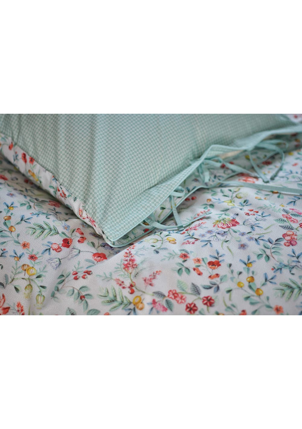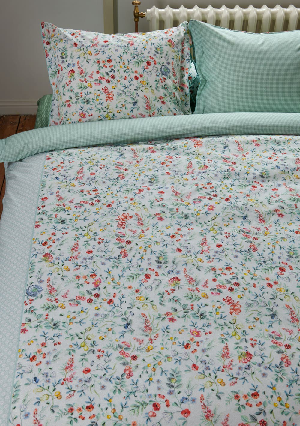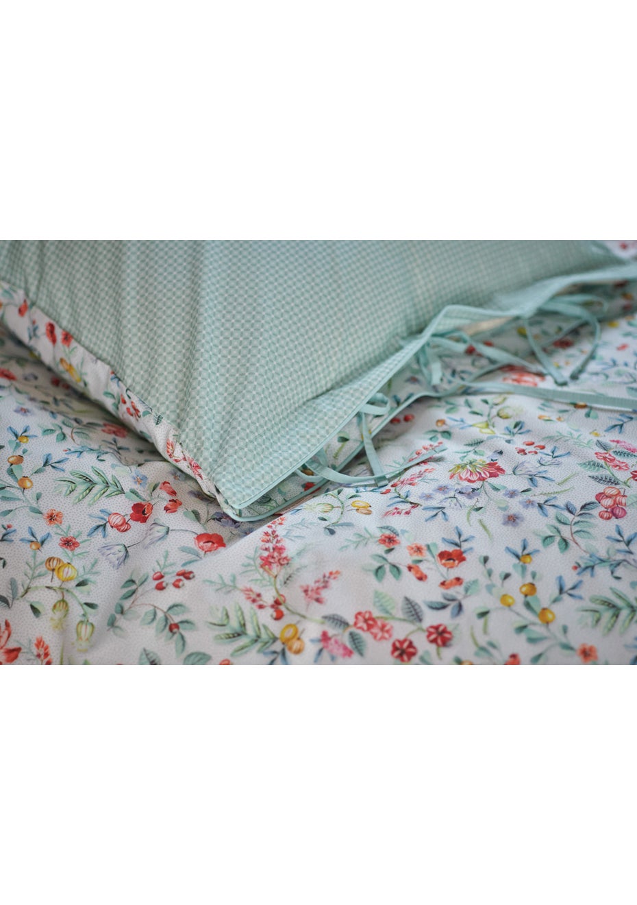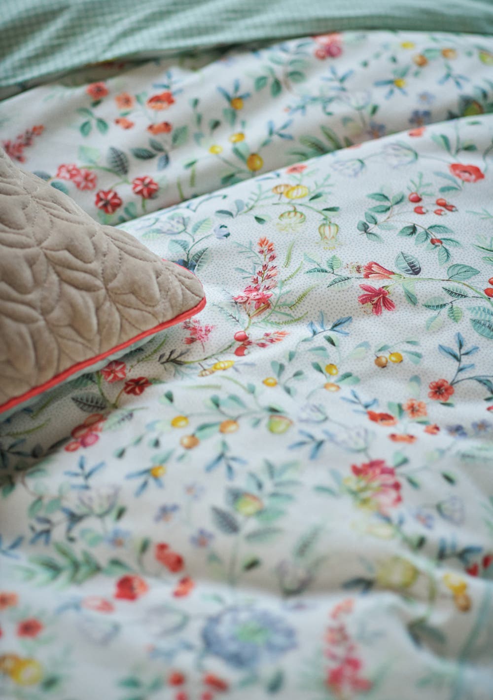 Duvet cover Midnight Garden has a fine all-over floral print made up of a variety of small flowers, berries and decorated leaves and vertical bands featuring a stamped tile print on either side. The light pastel colours on a light background give this cover an extra rich and luxurious look. The pillowcases and duvet cover have an oxford edge with a light blue trim. The pillowcases also have unique light blue tie closures. The back of both the cover and the pillowcases have a stylized tile print with refined details, Giving you the choice of two sides to mix and match to suit your personal style. The duvet cover is made of 100% cotton percale, 200 TC. Percale cotton is a luxurious material that feels even softer and more pleasant than regular cotton due to the use of finer yarn and a higher number of threads. Due to the high weave density, percale cotton bedding is also extra sturdy and stays beautiful for a long time.