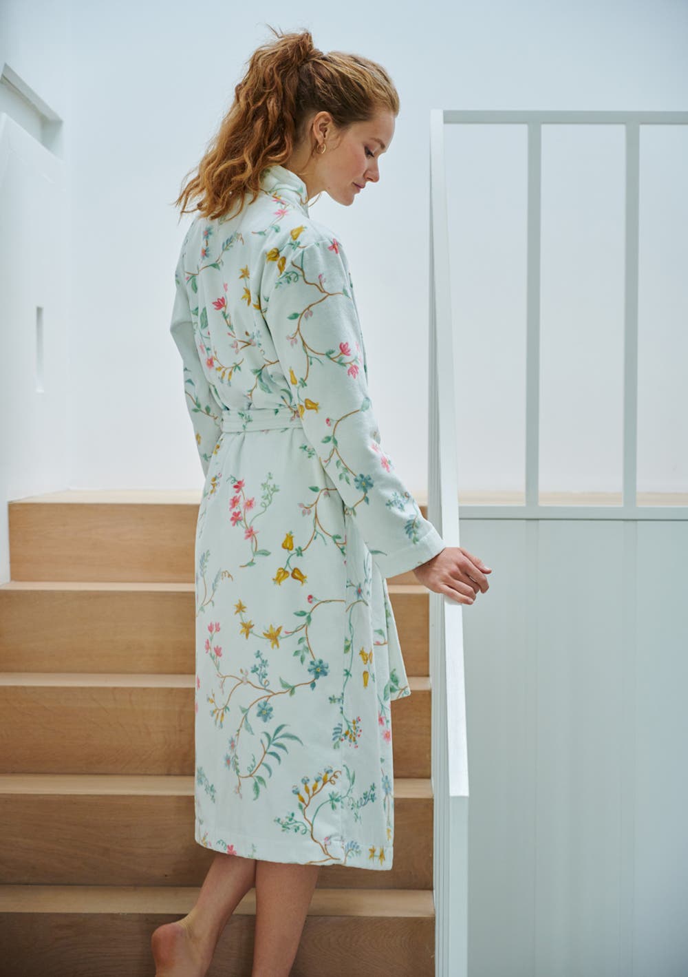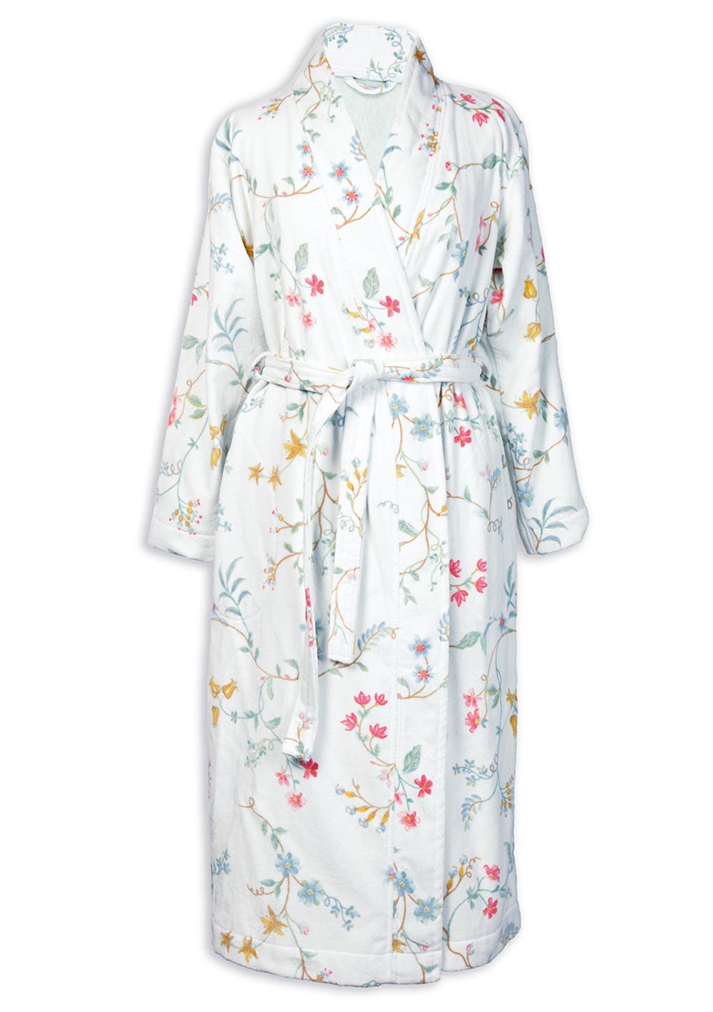 The Les Fleurs Bathrobe has a design of graceful flower sprigs with small decorated fantasy flowers. The inside of the bathrobe has a solid white color. The bathrobe has a beautifully fitted quilted collar, side pockets and closes with a long belt. The Les Fleurs bathrobe is made of 100% high-quality cotton terry velor.