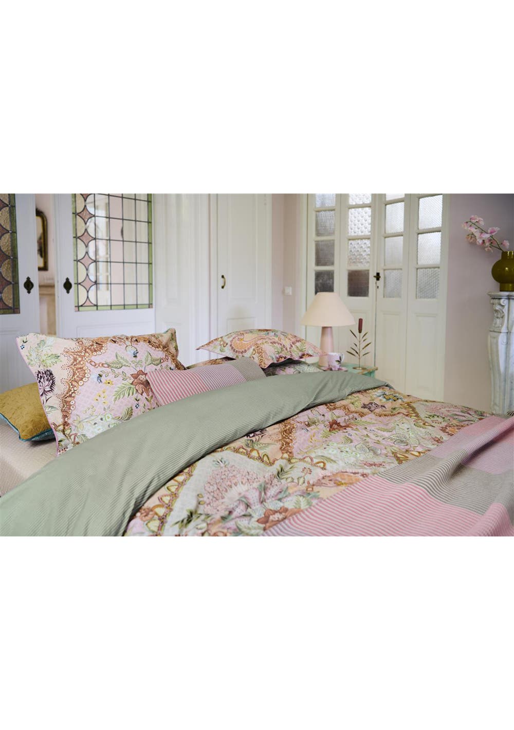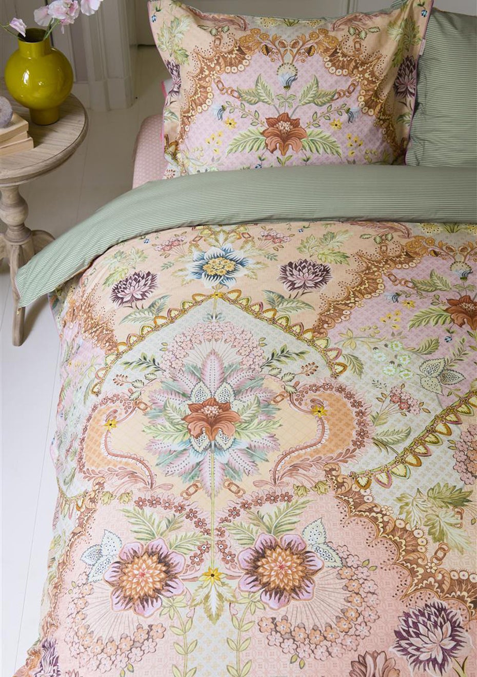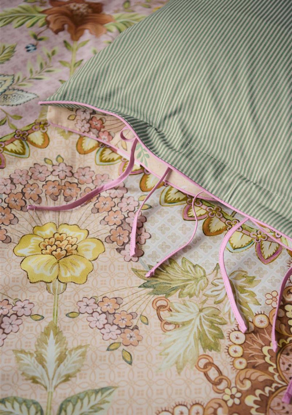 The Saluti Grandi quilt cover set features a symmetrically constructed floral pattern, inspired by the beautiful wallpaper motifs found in Italy. The back features a pattern of white and blue horizontal stripes. The quilt cover and the pillowcases have a stitched Oxford border on the sides, adding to the luxurious look. The pillowcases have a tie closure and an attractive design on both sides, just like the quilt cover. Perfect for creating a quirky mix-and-match effect. The quilt cover is not only an eye-catcher in your bedroom, the use of 100% cotton percale makes the cover wonderfully soft and the 200TC weave density ensures that the fabric remains beautiful for a long time.