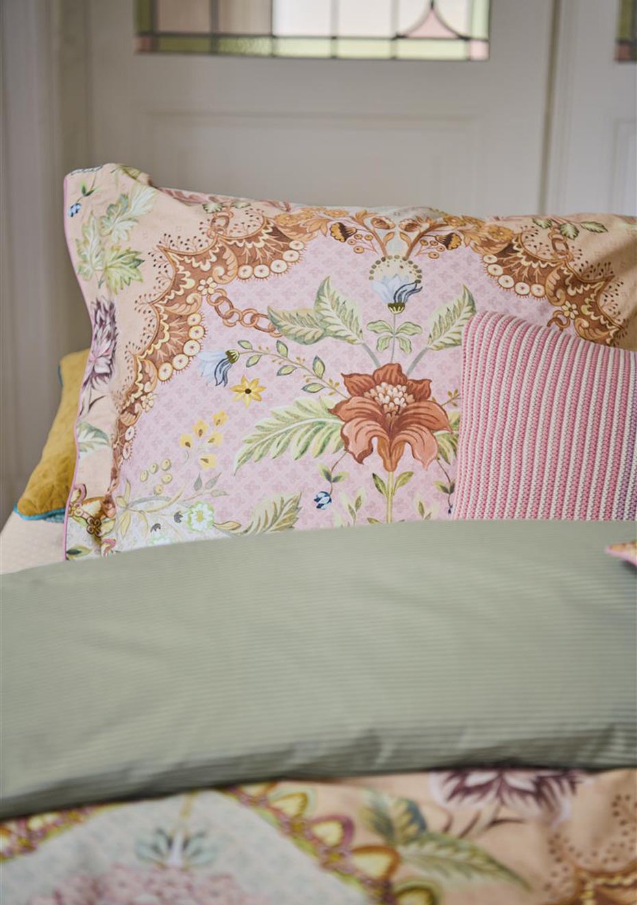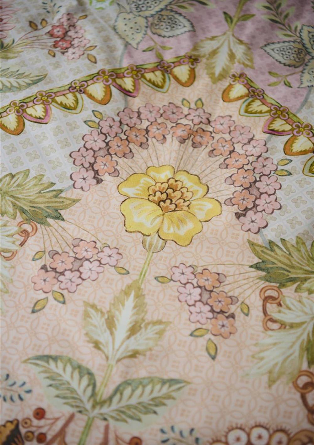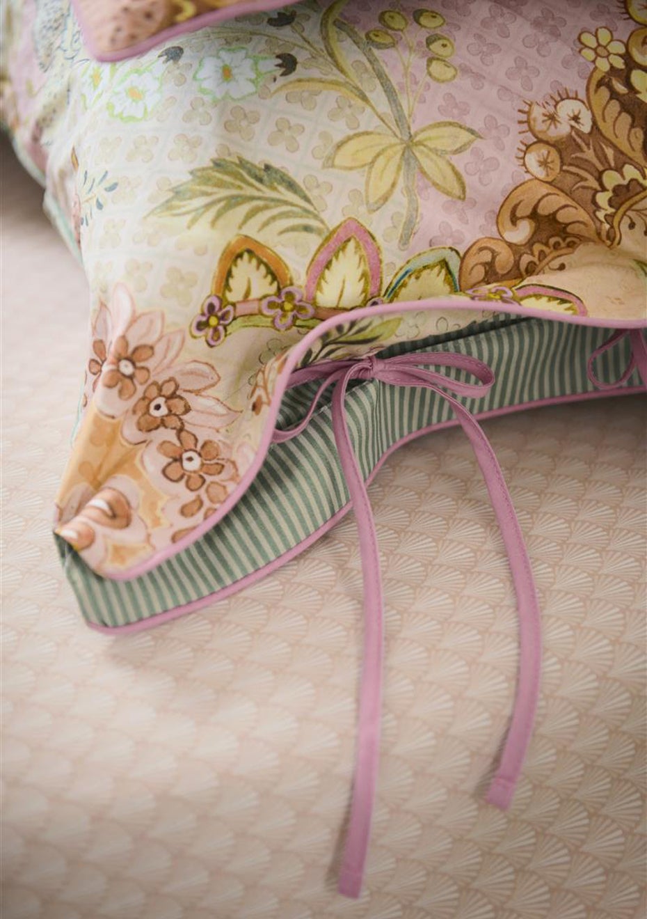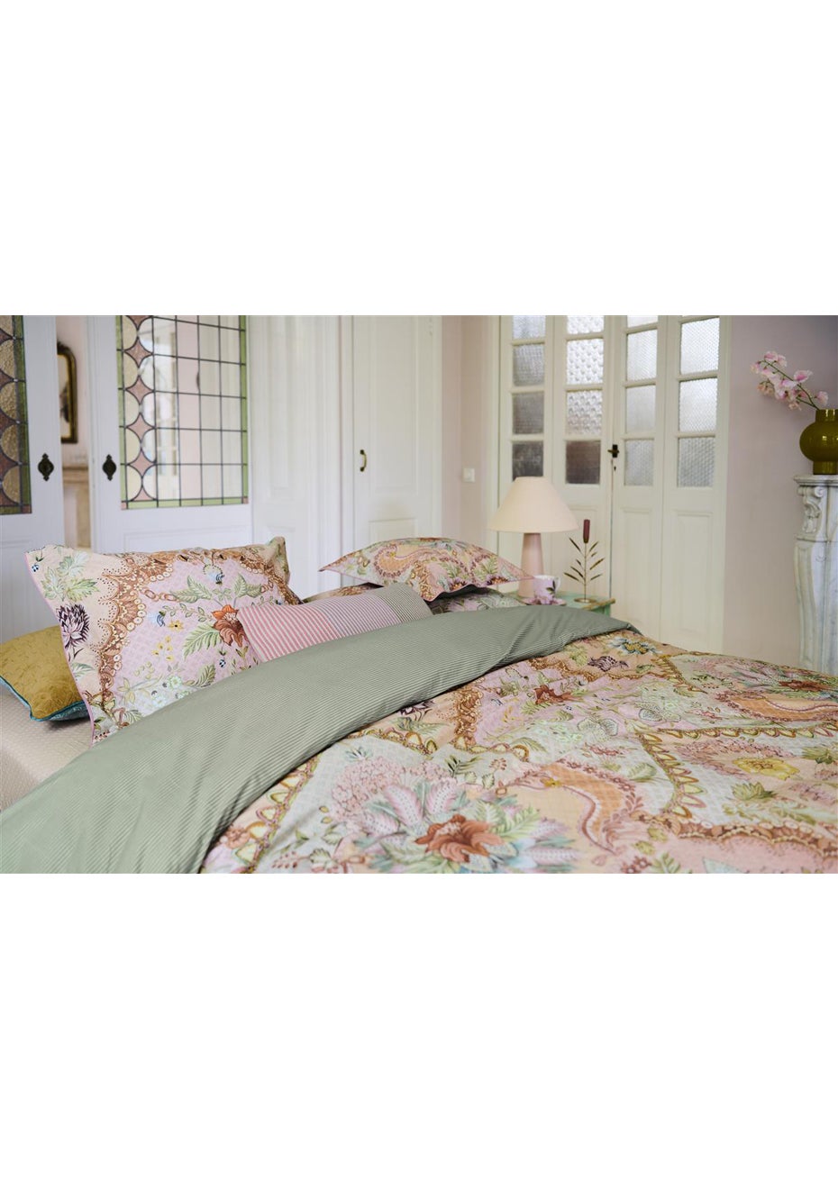 The Saluti Grandi quilt cover set features a symmetrically constructed floral pattern, inspired by the beautiful wallpaper motifs found in Italy. The back features a pattern of white and blue horizontal stripes. The quilt cover and the pillowcases have a stitched Oxford border on the sides, adding to the luxurious look. The pillowcases have a tie closure and an attractive design on both sides, just like the quilt cover. Perfect for creating a quirky mix-and-match effect. The quilt cover is not only an eye-catcher in your bedroom, the use of 100% cotton percale makes the cover wonderfully soft and the 200TC weave density ensures that the fabric remains beautiful for a long time.