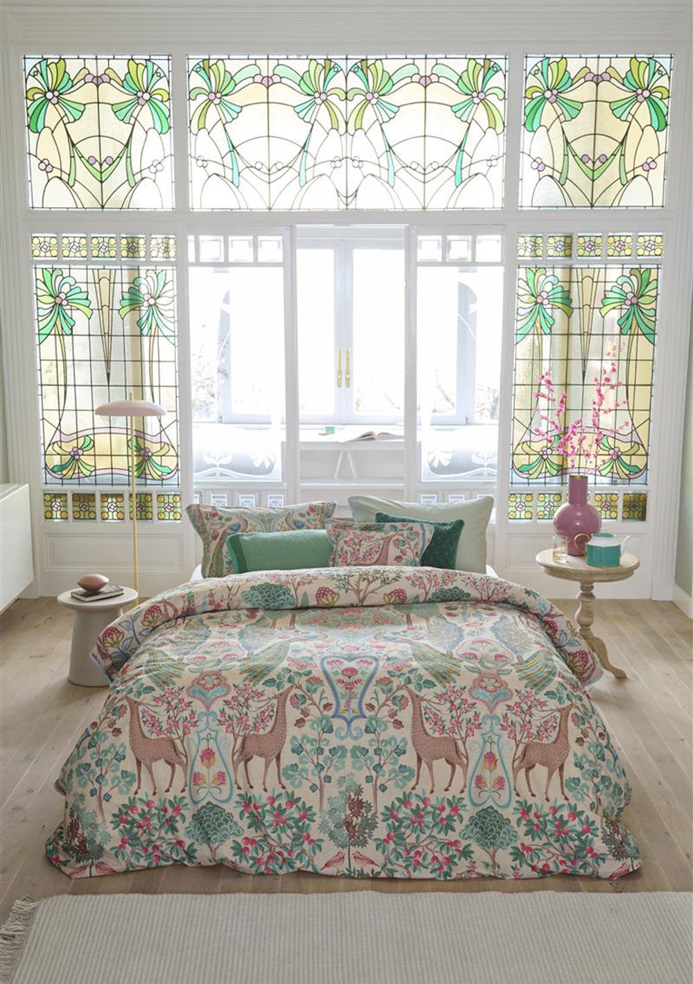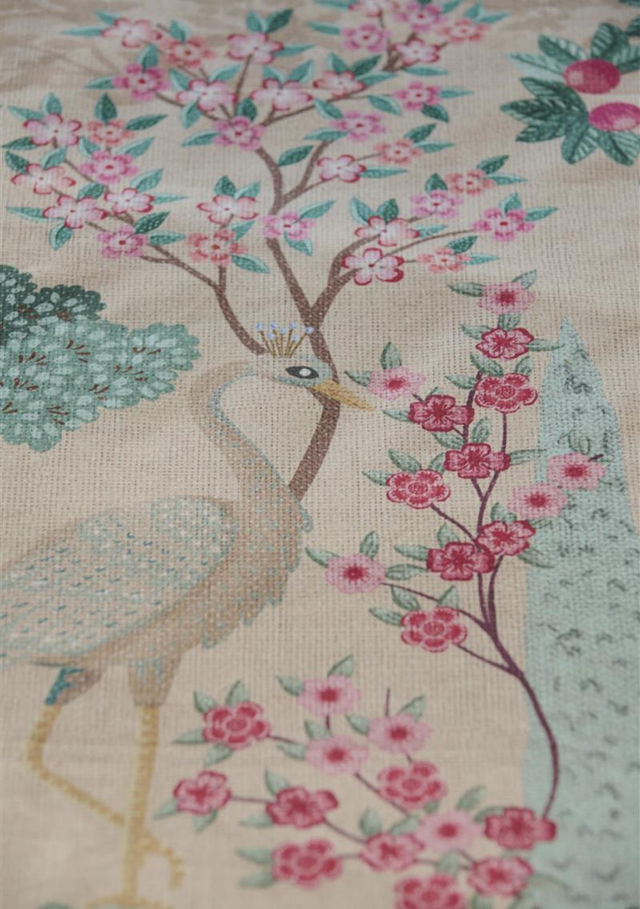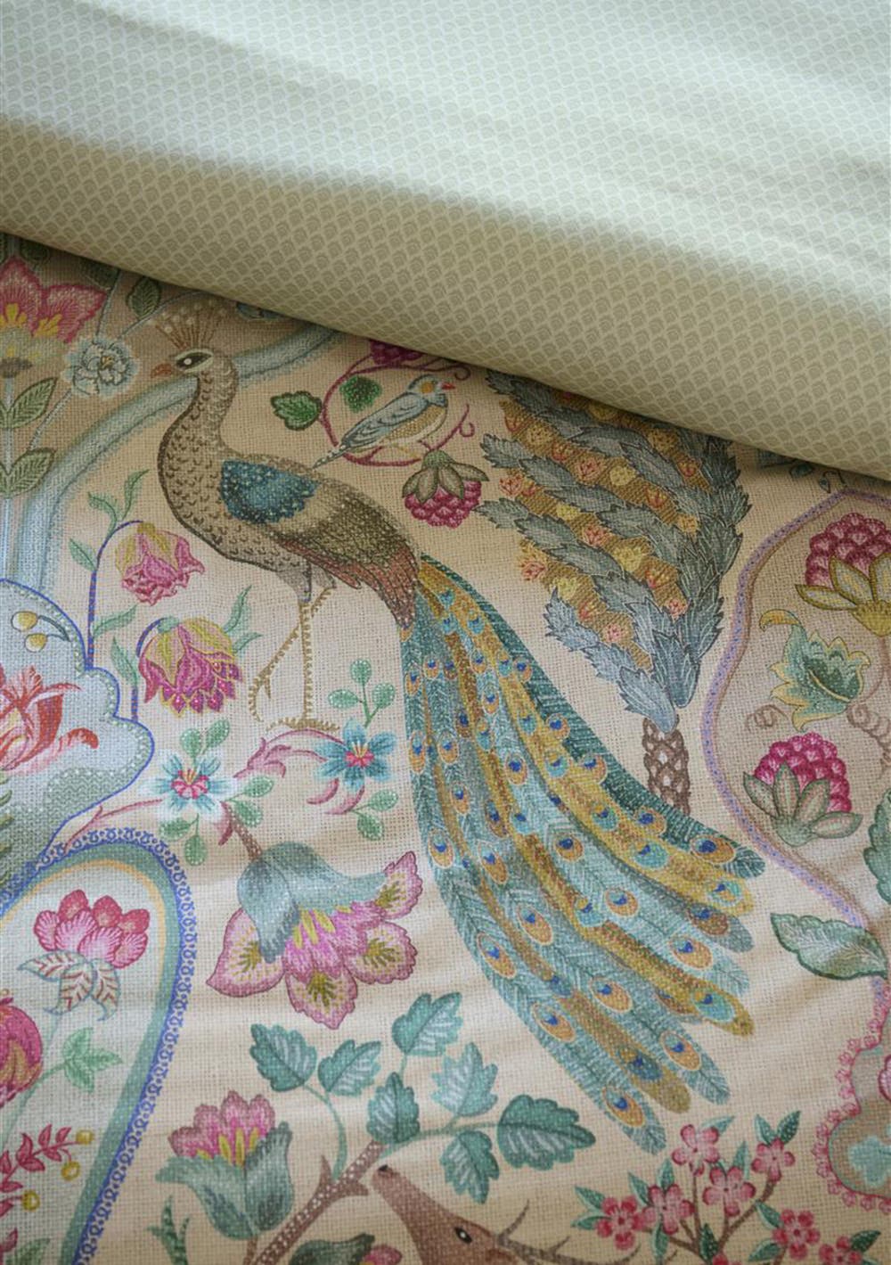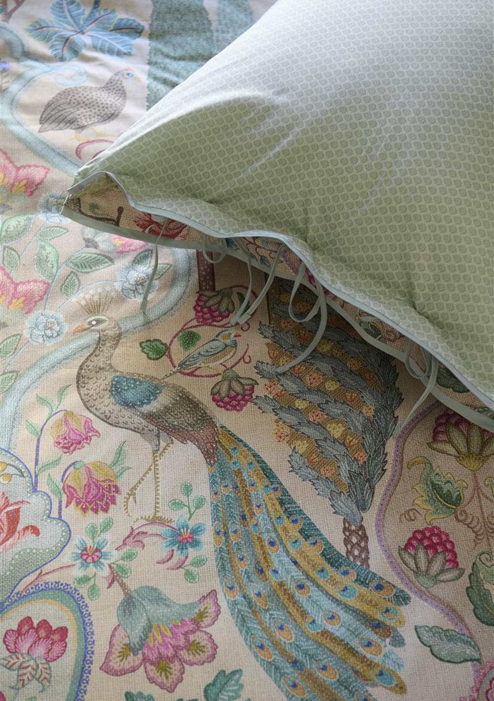 The Pavoni quilt cover has a mirrored design with ornate peacocks in the center. Deer, herons, and quail can also be seen among the flowers and decorated trees. The pattern on the back of the quilt cover is small foliage. The pillowcases and quilt cover have a stitched Oxford border on the sides and are finished with flat piping. The pillowcases also have a unique tie closure. All in all, this gives the quilt cover and pillowcases an extra lavish and luxurious look&feel. The back of the quilt cover and pillowcases have a foliage print, making it ideal for reversible use. Perfect for creating a quirky mix&match effect on your bed. The quilt cover is packaged in a beautiful textile bag made from the same fabric as the quilt cover. The bag is reusable and also allows you to see and feel the print of the quilt cover.