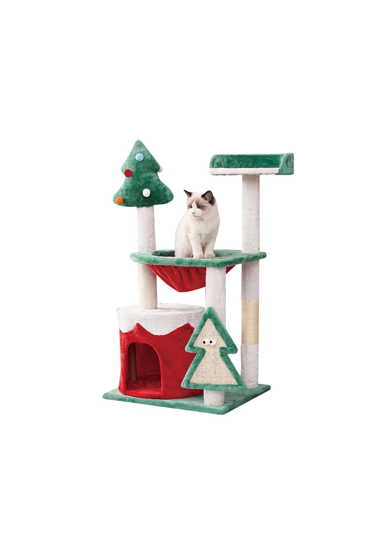 PR65661 - Cat tree Christmas 90CM An all-in-one scratching, perching, climbing, and resting cat tree. This space-saving cat tree is made to be narrow but has many different platforms so your cat can climb, jump, and rest! Suitable for cats and kittens of all sizes. If they are feeling lazy and do not want to be disturbed, this cat tree design has many different spots for them to have their own space. This cat tree design features multiple platforms, a Christmas tree house, and even a cat hanging basket! It has eco-friendly sisal posts for them to scratch on instead of damaging your carpet, curtains, and furniture. This unique cat tree is designed to provide your beloved feline with a cozy and stimulating environment, and a cute design of a Christmas tree Fresh your living room.NOTE: THIS CAT TREE SHOULD BE KEPT INDOORS TO AVOID THE WATER.(Please allow slight measurement differences due to manual measurements.)(Please note that due to differences in different computer screen resolutions, the actual color of the item may differ slightly from pictures.)Features:Christmas tree designSafe and SturdyMultiple unique platformsWarm cat houseCat scratching boardThick hemp rope postEye-catching colorEasy to assembleSpecifications:Material: Wooden, Cashmere, and SisalOverall dimensions:50 x 40 x 90cmColor:Green and RedAssembly required: YesPackage Content:Cat Tree x 1User Manual x 1 Package Dimensions: L52cmxW42cmX17cm