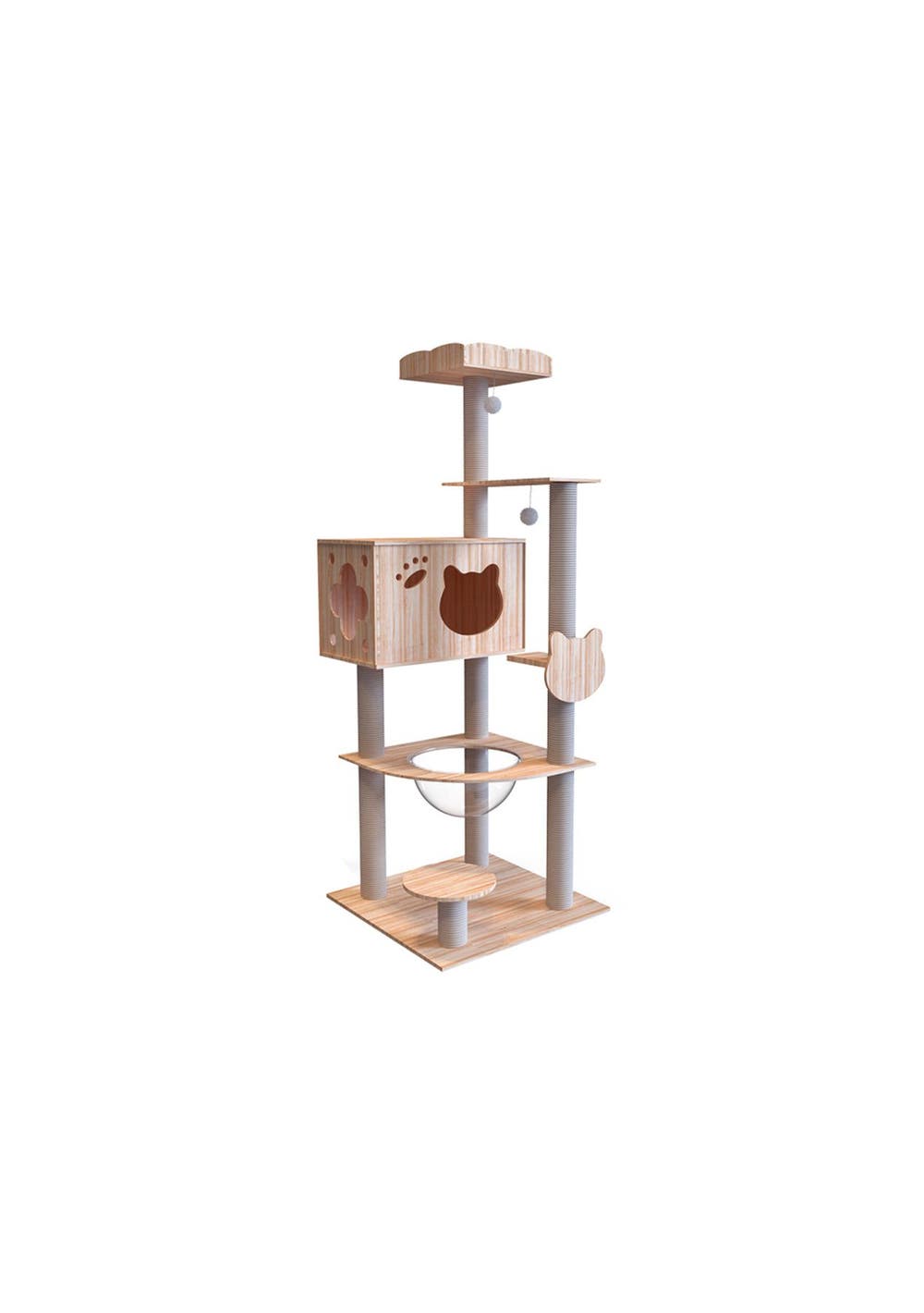 PR65667 - Cat Tree Wooden 165CMAn all-in-one scratching, perching, climbing, and resting cat tree. This space-saving cat tree is made to be narrow but has many different platforms so your cat can climb, jump, and rest! Suitable for cats and kittens of all sizes. If they are feeling lazy and do not want to be disturbed, this cat tree design has many different spots for them to have their own space. Made of durable wood, This cat tree design features multiple platforms, a big cat house, and even a panoramic capsule! It has eco-friendly sisal posts for them to scratch on instead of damaging your carpet, curtains, and furniture. NOTE: THIS CAT TREE SHOULD BE KEPT INDOORS TO AVOID THE WATER.(Please allow slight measurement differences due to manual measurements.)(Please note that due to differences in different computer screen resolutions, the actual color of the item may differ slightly from pictures.)Features:Sturdy wooden constructionMultiple unique platformsPanoramic capsuleHanging ball for cat playingBig cat houseThick hemp rope postEasy to assembleSpecifications:Material: Wooden, Cashmere, and SisalOverall dimensions:50 x 50 x 165cmColour: WoodAssembly required: YesPackage Content:Cat Tree x 1User Manual x 1 Package Dimensions:52cmx52cmx26cm