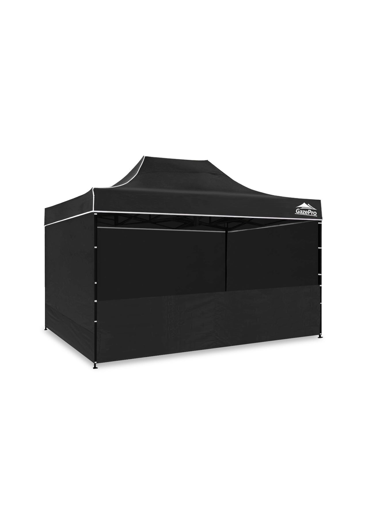PR9256 - Gazebo C Silver coated roof 3x4.5M Black Featuring high-density, long last silver-coated oxford fabric with effective UV & water-repellent treatments. With a thick & quick-to-erect powder-coated steel frame equipped with strong legs & struts structure, is very simple to set up & extremely durable. With a half wall for stall operators, you can configure your gazebo to suit any occasion.Note: Gazebos can be used free-standing when there is no wind but they need to be pegged onto the ground or would need sandbags or water bases to secure them. The gazebo is not designed as a permanent structure and it is not recommended to be used under extreme weather conditions or for a prolonged period of time.Recommended minimum 2-person set up.GAZEBO FEATURESRust-resistant frameHeat & water resistant roof4 adjustable height levelsEasy-glide internal joints for easy setupSafety Release cap for easy fold upGAZEBO SPECSBlack powder-coated steel frameGazebo Roof: Silver-coated 420D Oxford fabricGazebo Wall: 210D Oxford fabricGazebo Assembled Size: 3x4.5mGazebo Colour: BlackGAZEBO SET CONTAINS: 1x3x4.5m Gazebo Frame2xSide Wall 3x2m1xSide Wall 4.5x2m1xHalf Wall 4.5x0.75m