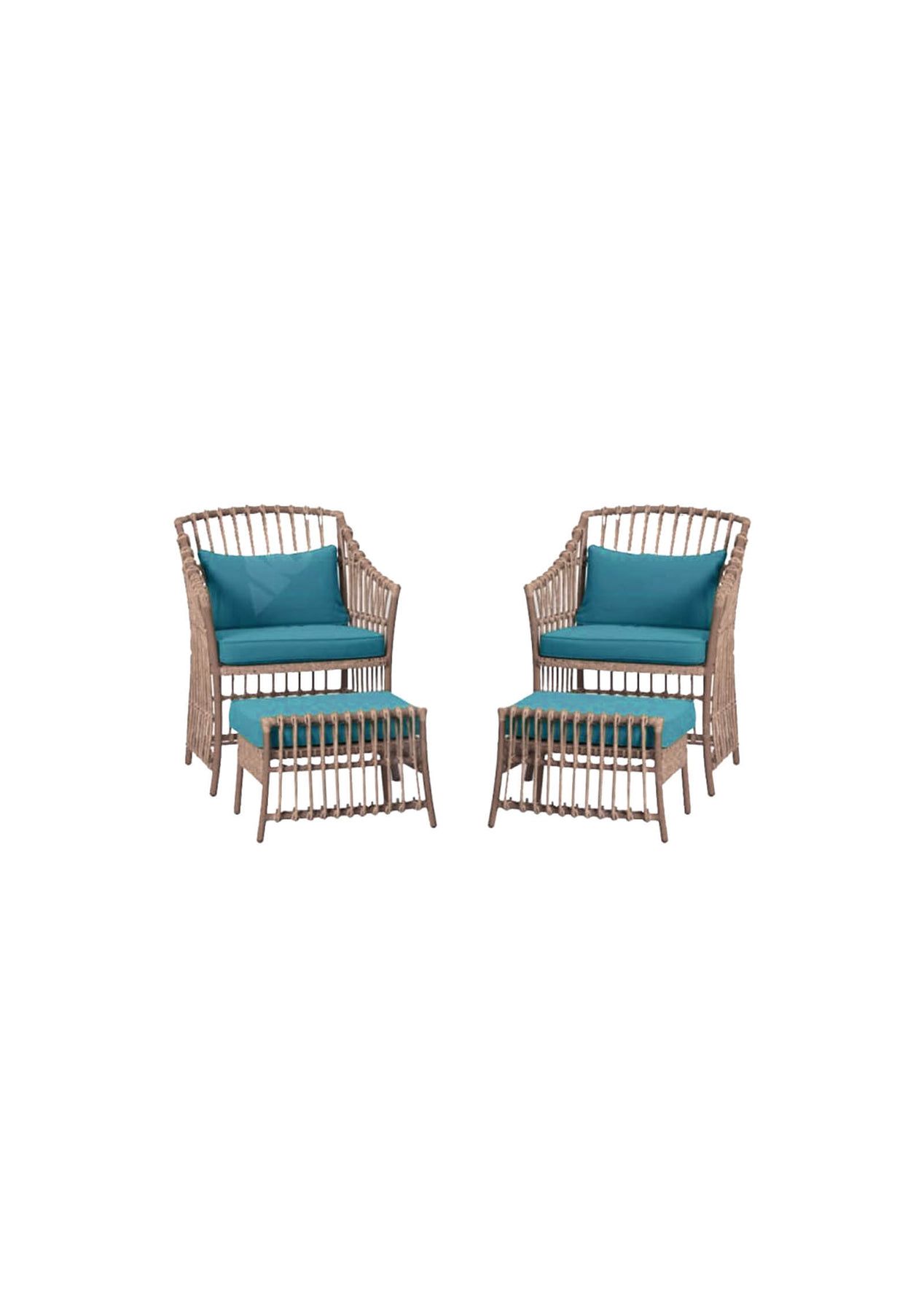 PR10140 - Madalena 4PC Patio Set Enjoy the pleasant outdoors or have a nice chat with friends over a cuppa with the Madalena 4PC Patio Set. From the sturdy metal steel frame and water-resistant PE wicker to the extra 6.5cm thick cushions, this durable outdoor set provides a perfect complement to your deck, patio, or balcony. With two stools that can be stored underneath the chairs perfectly, it is helpful to save space. Full of tropical ambiance, this patio set surely create a personal oasis with great comfort.FeaturesOutdoor and indoor useExotic design with elegant linesComfortable and durableSturdy steel framePremium high-density foam cushionsSpecificationsChair x2Stool x2Material: PE wickerFrame: metal steelChair capacity: 100kgStool capacity: 50kgCushion color: blueChair dimensions: 62x61x83.5cmStool dimensions: 54x40x37cm Package dimensions: 113 x 86 x 67CM