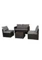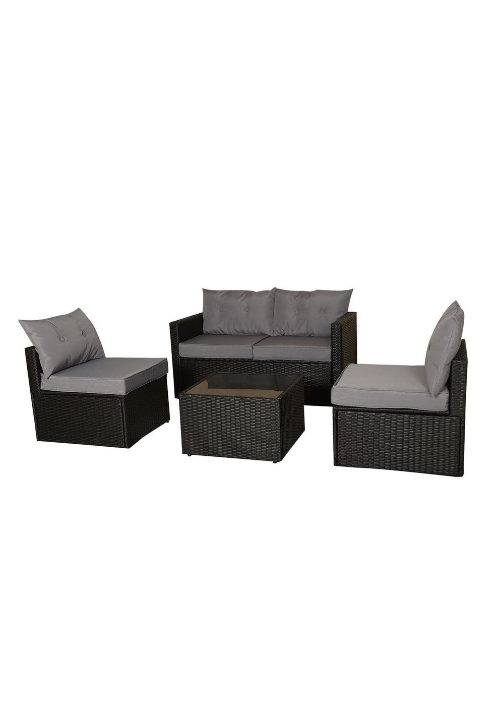 PR8953-4PC Modular Garden Sofa Set Black+GreyCrafted with PE wicker handiwork and a heavy-duty steel frame for exceptional durability and cushions with a high-density sponge, the 4PC Modular Garden Sofa Set gives you a comfortable sitting feel. The removable cushion cover is easy for cleaning. Great for creating your own personal oasis outdoors, this set is comfortable and easy to maintain. Able to fit a variety of living space styles and settings, this sofa and table set can be placed in an endless number of configurations. FeatureModular designHeavy-duty steel frameHigh-density foam seat cushionsRemovable cushion coversEasy cleaningSimple assembly requiredSpecification1 x 2-seater sofa2 x armless chairs1 x coffee table with tempered glassRattan Material: PE Rattan color: blackCushion color: greyDimensions: Chair: 56x66x61 cmSofa: 135x66x61 cmTable: 60.5x60.5x37.5 cmCushion thickness: 8.5cm Packaging Dimensions113x35x65CM
