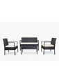 PR666445 - Classique Outdoor Lounge 4Pc This outdoor garden furniture set is characterized by excellent durability and optimal design. Two comfortable armchairs and a sofa are perfect for relaxing and socializing. Pillows with approx. 6cm and resistant to weather conditions. Elegant table completed with a plate of black tempered glass. Enjoy the sun on your terrace with this elegant rattan furniture set!FeaturesSet includes 2 armchairs, 1 sofa, and 1 tableCushion color: WhiteMaterial: WickerFrame: Powder Coated SteelThe Garden furniture set is characterized by excellent durability and optimal designTwo comfortable armchairs and a sofa are perfect for relaxing and socializingPillows with approx. 6cm filling with foam is includedThe unique set is made of a durable powder-coated steel frame and brown, UV-resistant polyrattanPillows are water-repellent.Product DetailsPieces Included: 2 Arm Chairs, 1 Sofa, 1 Table, and 3 Seat CushionsDurability: Weather ResistantSpecs:2 Seater:W108xD60xH711 Seater: W59xD60xH71Table : W75xD41xH38Rattan Color: BlackCushion Color: Ivory Care and maintenance to extend the life of your outdoor furniture- Store in dry place or use protection covers when not in use - Keep cushions dry and away from sunlight to reduce fading /Fraying when not in use- Treat metal surfaces with rust inhibitor coating as required- Avoid exposing synthetic rattan to high temperatures over a long period of time Dimensions:116x36x57 CM