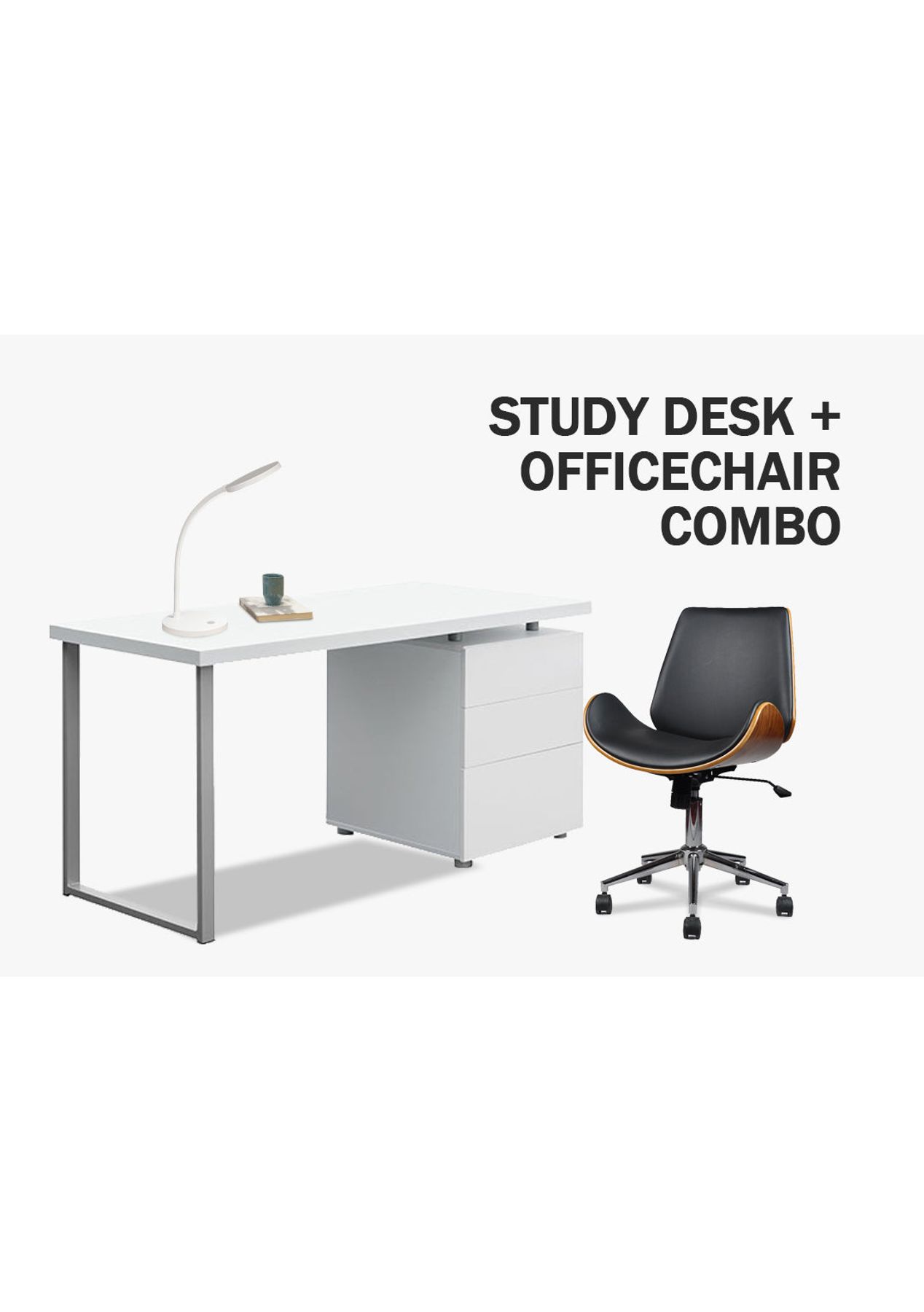 PR6841 - Katrina Study Table White + Bentwood Office Chair ***THIS LISTING IS FOR DESK AND OFFICE CHAIR*** Desk FeaturesU-shaped powder-coated metal leg Reinforced veneer particle board desk 3-drawer cabinet Cabinet on left or right at your preferenceReinforced veneer particle board Anti-rust coated metal runners in drawers Desk Dimension: 140 (L) x 60 (W) x 72 (H) cmCabinet Dimension: 48 (L) x 56 (W) x 60 (H) cm Colour: White Chair FeaturesStylish wooden seat basePremium PU leather seatCushioned back and seat supportCorrosion-resistant chrome base360°swivel seatHeight adjustmentTUV-certified gas liftSmooth castor wheelsEasy to assembleMaterial: Wooden frame & PU leatherCastor wheels: 5Overall height: 98 - 101cmColour: Brown wooden frame with black PU leather Please note: Desk also available in Black color *subject to availability, please check with the store for details
