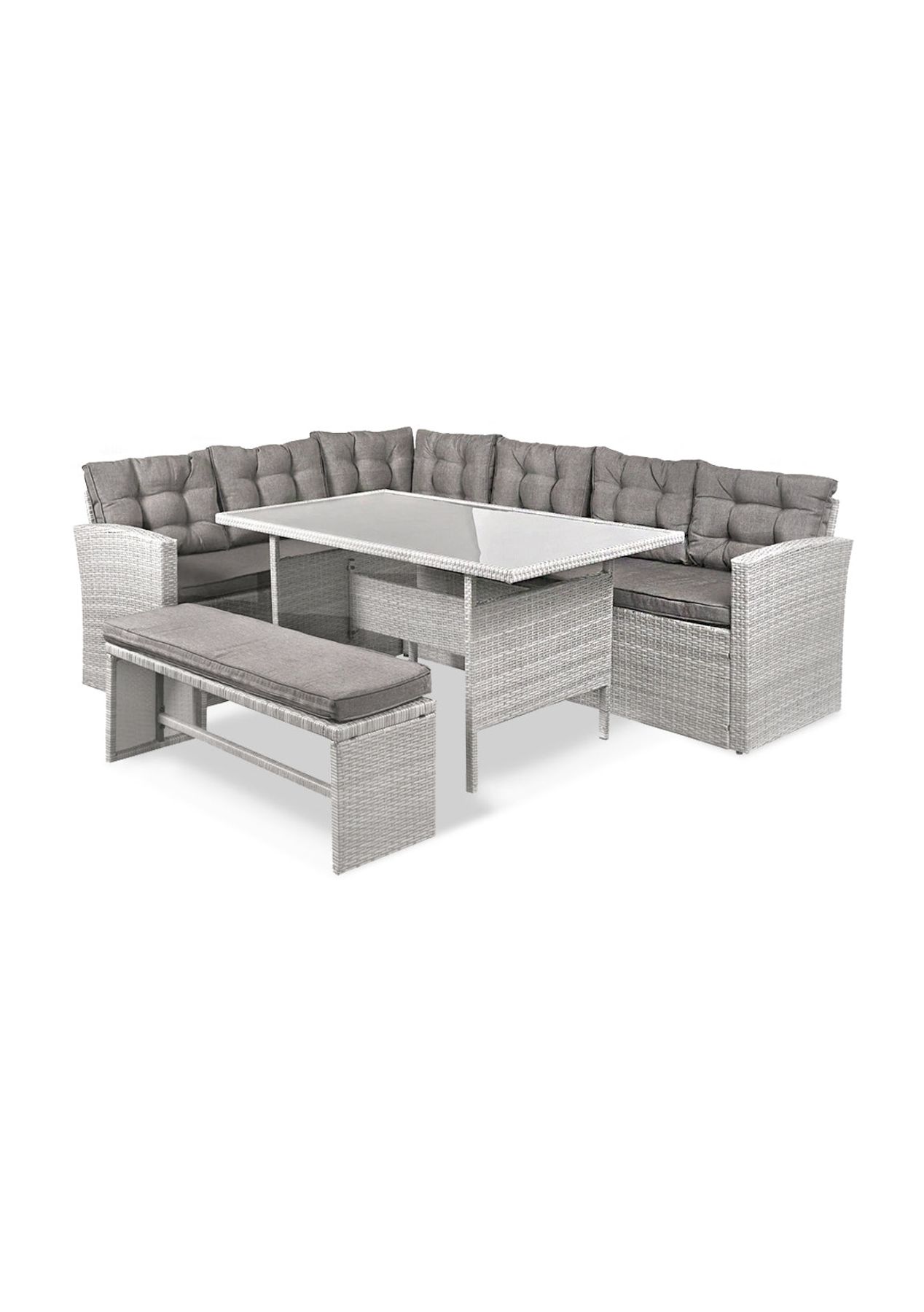 PR2845 - T Outdoor Furniture Steel Catania Outdoor Dining Set The CATANIA 4 PCS sectional conversation set is constructed from high-quality materials. A beautiful landscape on your patio and a comfortable place to enjoy your leisure time. We are proud to present this brand new 4 piece patio wicker corner sofa dining set. It’s an attractive and handsome furniture sets which in a excellent price. Zippered cushions filled with a thick sponge for optimal comfort and relaxation. All-weather hand woven PE rattan can withstand moderate changeable weather (To prolong service life, Extra protection will be needed for some extreme weather conditions) Now, please enjoy a calm and soothing night or a cool sunny day on your new conversation set.SpecificationsColor: Rattan: Light Grey, Cushions: GreyRattan Material: PE rattanCushion Material: Water resistant polyester fabric and sponge padded Frame Material: Powder Coated SteelAssembly requiredDimensions (L×W×H)3 Seater: 169x67x73.5cm3 Seater: 177x67x73.5cmBench: 120x35x39cmTable: 145x80x71cmCushion thickness: 5cmContents1 x 3 Seat Sofa1 x 3 Seat Corner Sofa1 x Bench1 x Dining Table with tempered glass topSeating and Back support cushion Please click here for assembly instructions. Care and maintenance to extend the life of your outdoor furniture - Store in dry place or use protection covers when not in use - Keep cushions dry and away from sunlight to reduce fading /Fraying when not in use- Treat steel surfaces with rust inhibitor coating as required- Avoid exposing synthetic rattan to high temperatures over a long period of time It comes in 2 boxes.DimensionsBoxA: 170x54x75CMB: 147x82x10CM