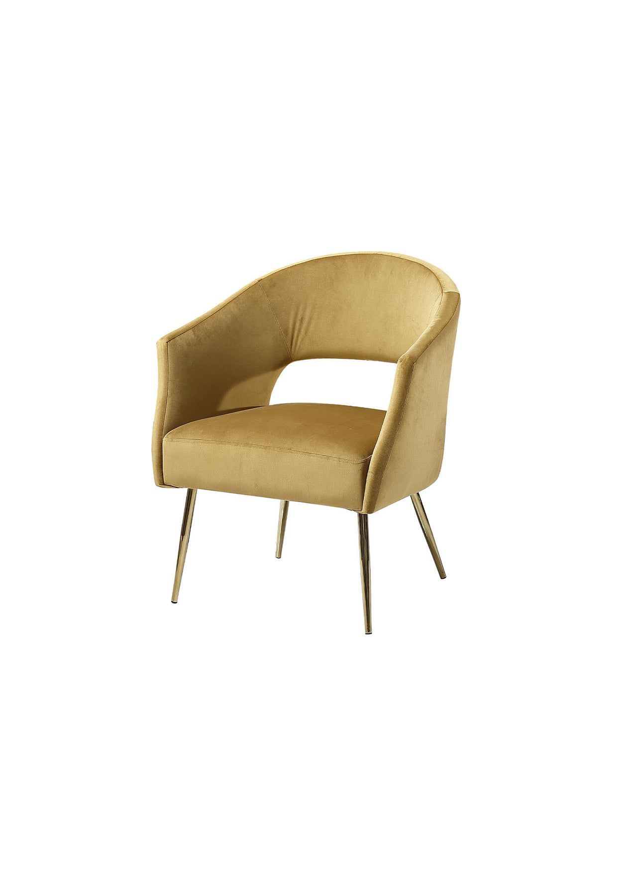 PR9534 - Melinda Accent Chair Velvet MustardOur Melinda Accent Chair is the epitome of trendsetting style designed for the bold and passionate. With its thick padding of high resilience foam and velvet fabric upholstery, the chair is perfect as a reading chair or a favorite relaxation seat. The vintage-style scallop shell back wraps around and hugs your body to provide perfect support and comfort. The splayed metal legs in glamorous gold give the chair loads of character as well as providing a very stable base. Not least, the workmanship is meticulous with the fluid corners and sturdy wooden frame. This chair will blend well with any setting from classic to contemporary and will also soften the flow of rooms with angular furniture and accents.FeaturesGolden splayed metal legsSoft velvet upholsteryHigh resilience foamReinforced steel fixingsEasy assemblySpecificationsSeat material: Velvet fabricFrame: WoodenLegs: MetalColour: mustardOverall dimensions: 62x70x83.5 cmWeight capacity: 130kg Package Dimension: 73 x 64 x 56cm
