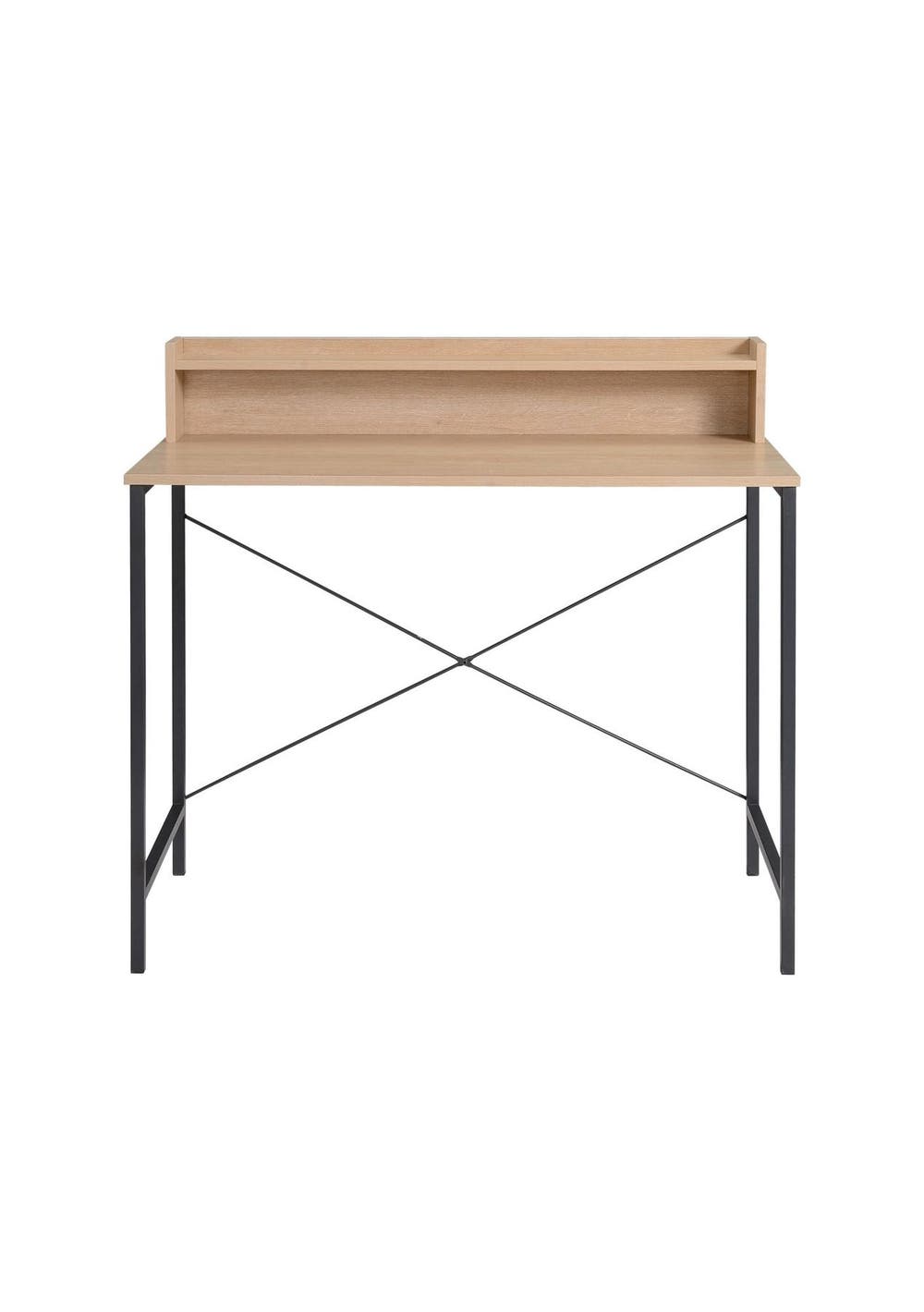 PR8771 Metal Frame Desk with Shelf OakConstructed with power coating metal frame and oak color top, this simple and clean line design yet functional student desk fits in your room easily. Adding a hutch on top of the desk creates a little more space for displaying your accessories and transforms into a great working space. Three colors of oak, walnut, and black are available. SpecificationProduct Size: 100*50.8*92.6cmMaterial: Particle Board laminated, powder coating metal frameColor: Oak