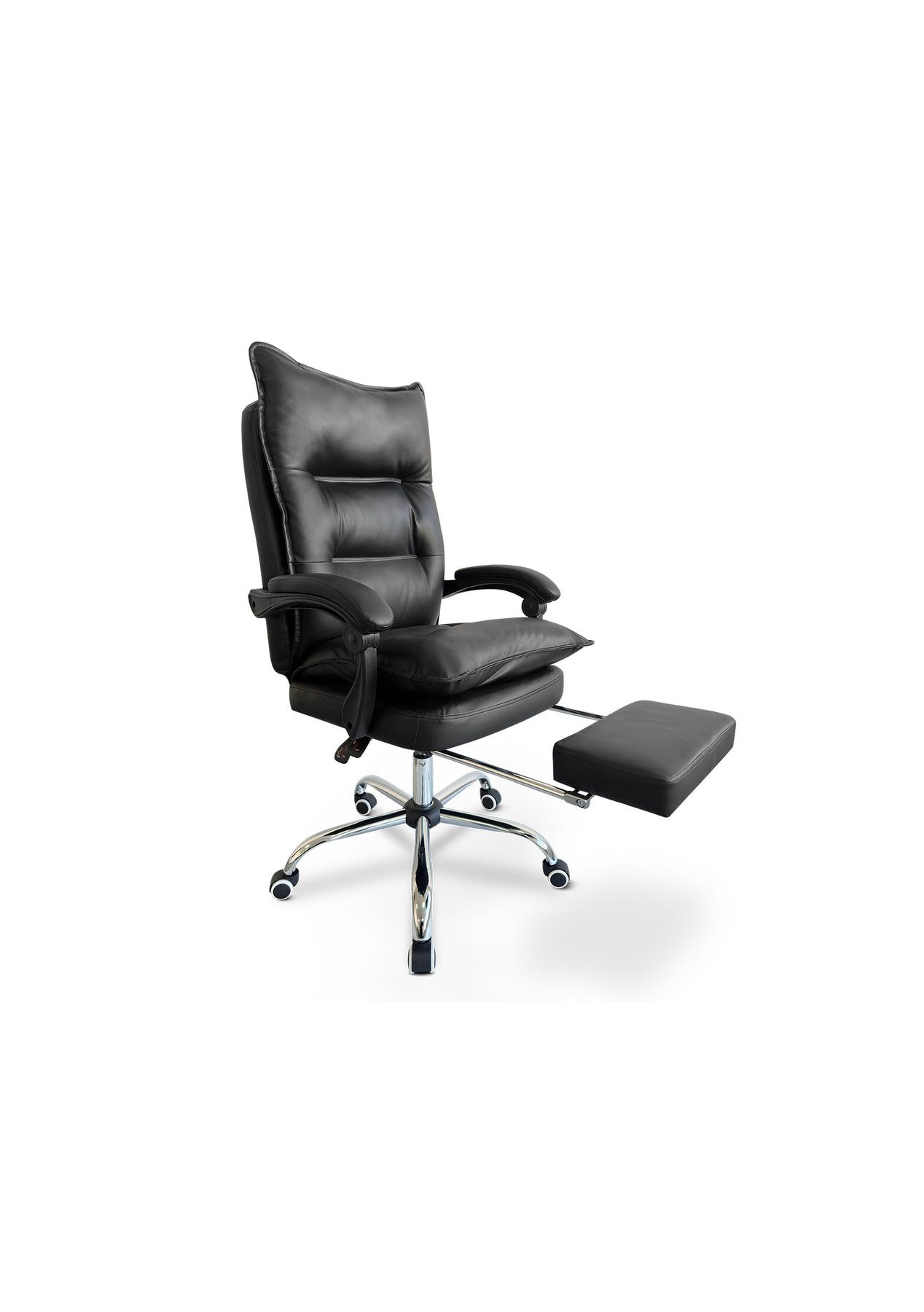 PR12673 New Markus Office Chair with Footrest PU Black This is our New Markus Office Chair. It features a chrome base with easy height adjustment and tilt function, as well as a 360° swivel and five durable nylon caster wheels that roll easily. The chair allows 170 degrees of backward movement, which can be lying down for rest. You can adjust it to a lowered angled position for taking a quick nap, which is very comfortable. Not least, the chair comes with a retractable footrest when you need it. With a thick contoured headrest and armrests, and ergonomic office chair design with double-layered cushions for chairs, you can have continuous comfort for long hours of gaming or working.FeaturesErgonomic high back designDouble padded seat and back 170º reclining backHeight adjustment360° rotatable seatPull-out footrestNylon armrests with padded topDurable chrome base Five nylon castor wheelsOffice Chair Weight Capacity: 130kgSpecificationsColor: Black Overall Dimension: 67 x 74 x 110-120 cmAssembly required. Package Dimension: 73.5*37*65CM