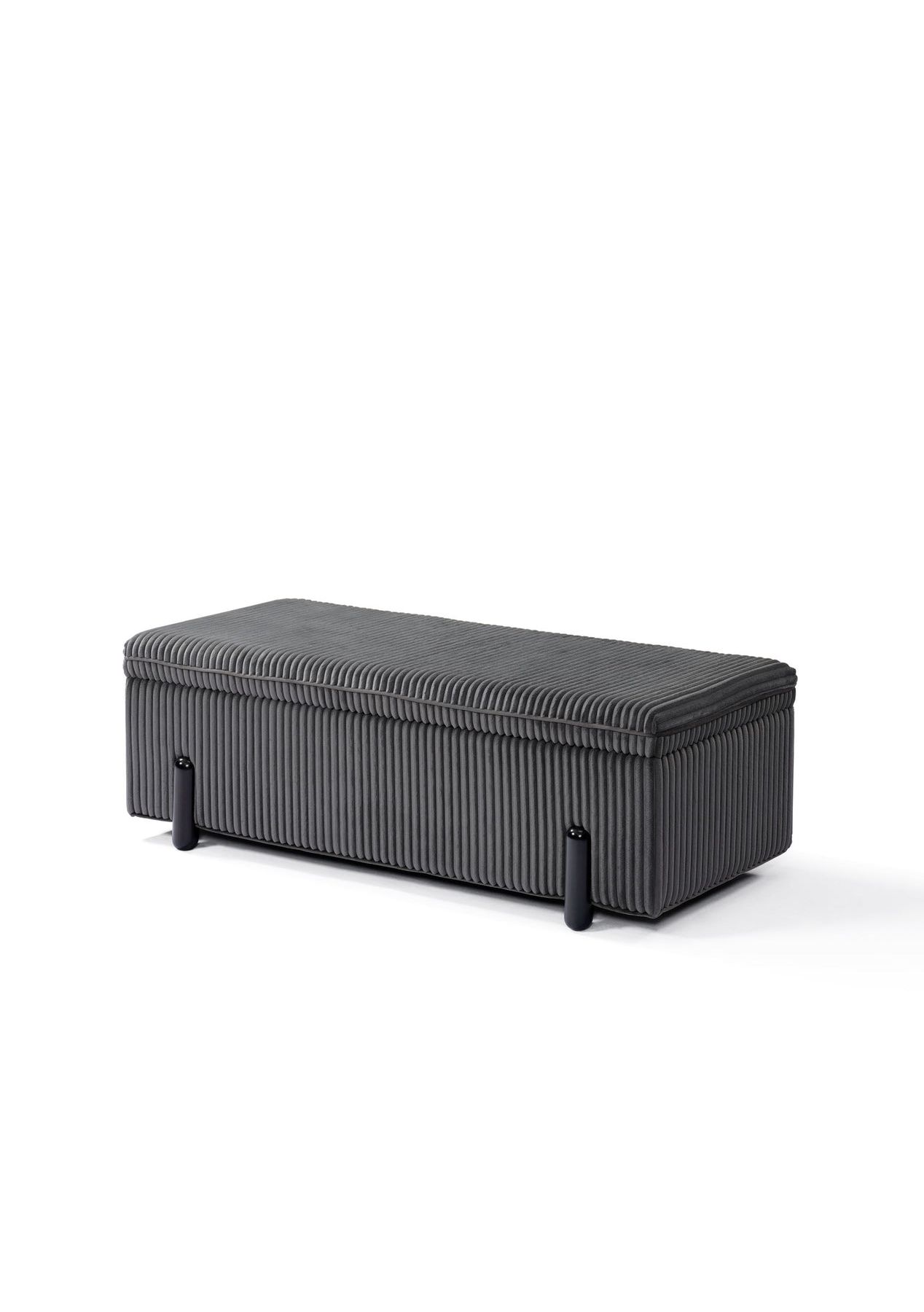 PR65610 Arna Ottoman Grey Immerse into luxurious comfort with its plush foam padding, while the ottoman serves as a versatile addition, functioning as a footrest, extra seat, or as extra storage. The sophisticated dark grey corduroy upholstery elevates the aesthetic of any room, while the ample storage space presents its multi-functionality.. Whether you're unwinding with a good book or putting your feet up for a rest, this Arna ottoman is guaranteed to enhance your home experience.==Specifications==* Product size: 1235 x 515 x 415mm* Inner size: 1105 x 355 x 264mm* Material: Corduroy, Wooden legs* Color: Dark grey