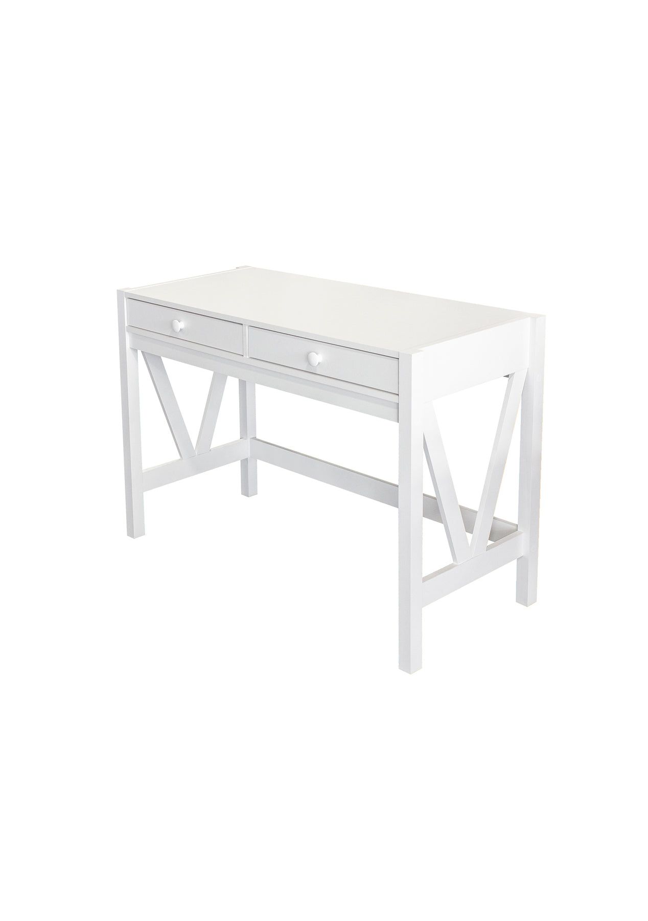 PR9137 Karra V-Side Table / Desk Creating a fresh and modern Hamptons style in your home, our Karra range may help a bit. Chic crispy white color with clean lines design, our Karra range offers you an elegant and classic look to your home design. V-shape sides in detail present its elegance and simplicity that add character and soul to the space. Add this timeless Karra piece, it absolutely goes with your adored interior style easily.This table suits in your hallway, study room, and your bedroom. Specification* Product Size: 1117*457*762mm(L*D*H)* Material: Particle board + Paper lamination* Two drawers with wooden knob handles* Color: White Packaging Dimensions: 113.6x 51.7x 12CM
