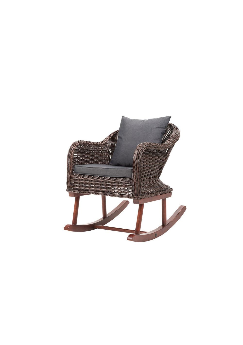 PR8813 - Cannes Rocking ChairThis Cannes rocking chair is aesthetically and ergonomically designed to make a comfortable as well as a striking addition to your living room, patio or garden.Thanks to the weather-resistant and waterproof PE rattan, the rocking chair is easy to clean, hard-wearing and suitable for daily use. Its aluminium frame and Merbau timber legs make it stable and highly durable. The thick cushions are easy to clean and provide extra comfort. Relax and enjoy your leisure time with our Cannes collection outdoors with assured quality.Colour: Mixed Brown Rattan, Grey Cushion CoverChair material: PE rattan + Aluminium Frame + Merbau Timber LegsCushion material: 100% polyesterDimensions: 75 x 60 x 80 cm (W x D x H)Cushion cover washableEasy to assemblePackage Contents: 1 x rocking chair, 1 x seat cushion, 1 x back cushion Care and maintenance to extend the life of your outdoor furniture - Store in dry place or use protection covers when not in use - Keep cushions dry and away from sunlight to reduce fading /Fraying when not in use- Avoid exposing synthetic rattan to high temperatures over a long period of time Packaging Dimensions59x51x73CM Weight Capacity: 120kg