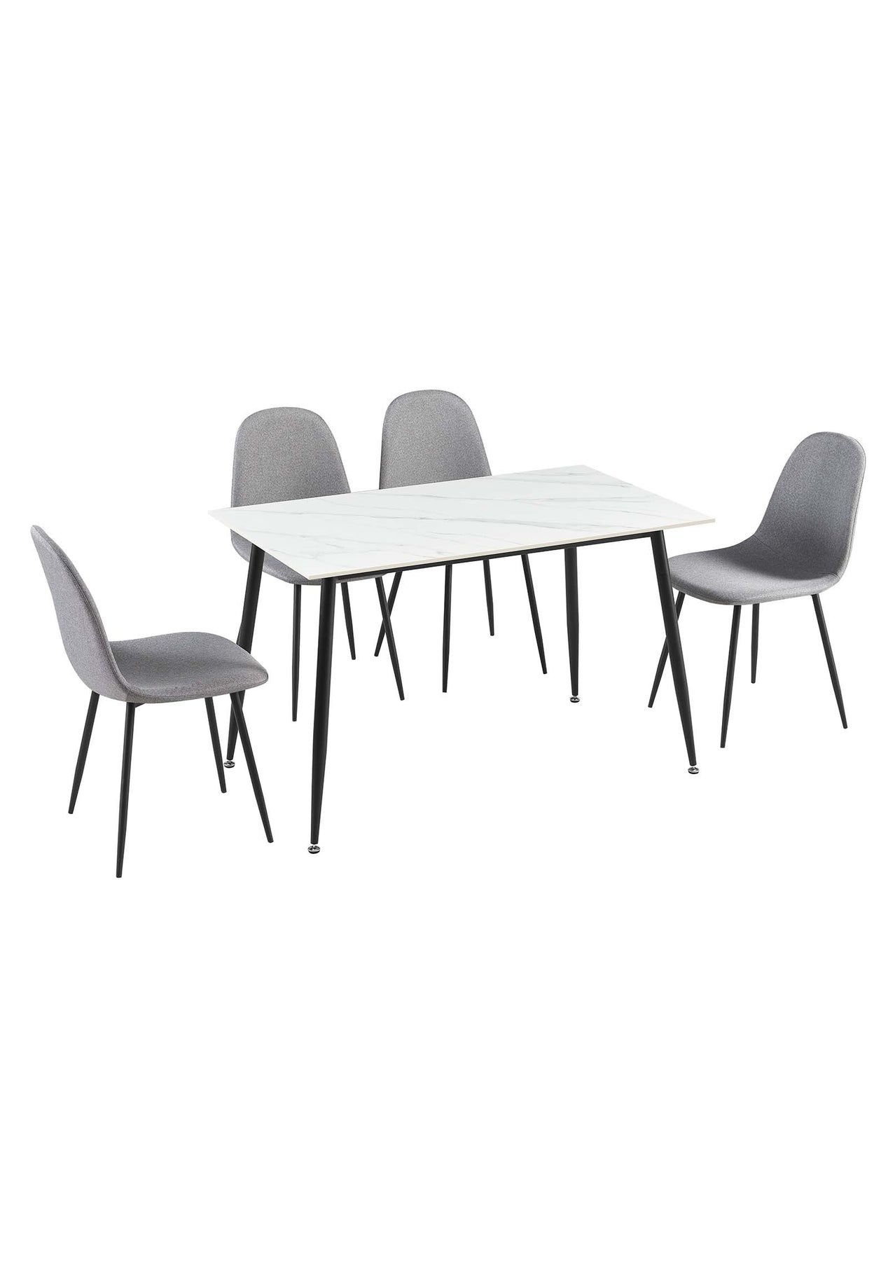 PR72036 - Esther 5PC Dining Set If you are after a dining set that is stylishly designed with a modern appearance and one that is versatile, you will love our Esther 5PC Dining Set. Beautifully crafted with sintered stone table top and splayed metal legs, the dining table is strong and sturdy with a presence that blends perfectly with any décor. As for the chair, the vintage-style scallop shell back wraps around and hugs your body to provide perfect support and comfort with its thick padding of high resilience foam and linen fabric upholstery. Not least, the dining set will blend well with any setting from classic to contemporary and soften the flow of rooms with angular furniture and accents. Note: Each tabletop pattern is a bit different. FeaturesTable x1Chair x4Table:Reinforced sintered stone topSmooth round edgesHeavy duty fixingsPower-coated metal legsAnti-slip legsChair:Splayed metal legsDurable linen upholsteryReinforced steel fixingsAnti-slip feet padEasy assembly SpecificationsTable dimension: 120 x 70 x 75 cmTable top thickness: 11mmTable weight capacity: 45kgChair dimensions: 45 x 55.5 x 86 cmChair weight capacity: 120kg
