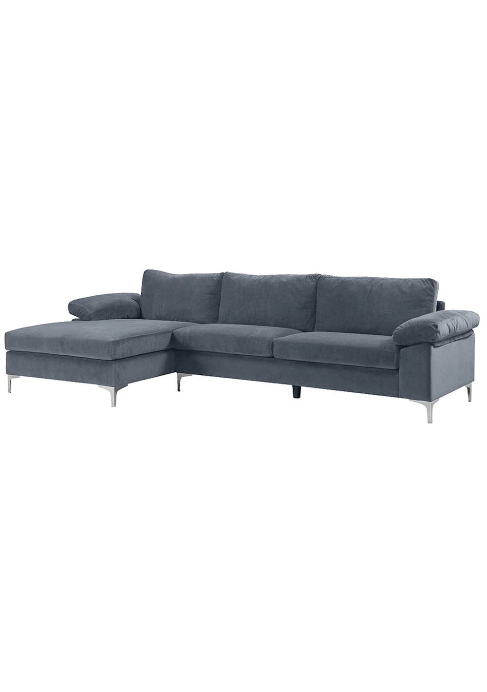 PR12678-New Ronni Sectional Sofa with Left Chaise Velvet Dark Grey This Ronni Living Room Sofa is a perfect place to lounge, watch TV or relax with family and friends. Constructed with a wooden frame, filled with premium foams and upholstered in breathable velvet fabric, our sofa is sturdy in every way. The seats are comfortable with soft cushions and ample support for your back too. Suitable for a variety of space and style, this sofa offers you the ultimate experience and helps the body to fully relax. It will give your home the renaissance it deserves.Note: Actual product colours may vary due to lighting, studio photography, room conditions, or different screens on various devices.FeaturesModern designSturdy wooden frameSoft touch faux velvet fabricThick padded seatMetal legsMiddle support legEasy assemblyWeight Capacity: 350 KG SpecificationsMaterial: velvet fabricFrame: WoodenLeg: metalColour: dark greyDimension: 262x130x86cm Please click here for Assembly Instructions.