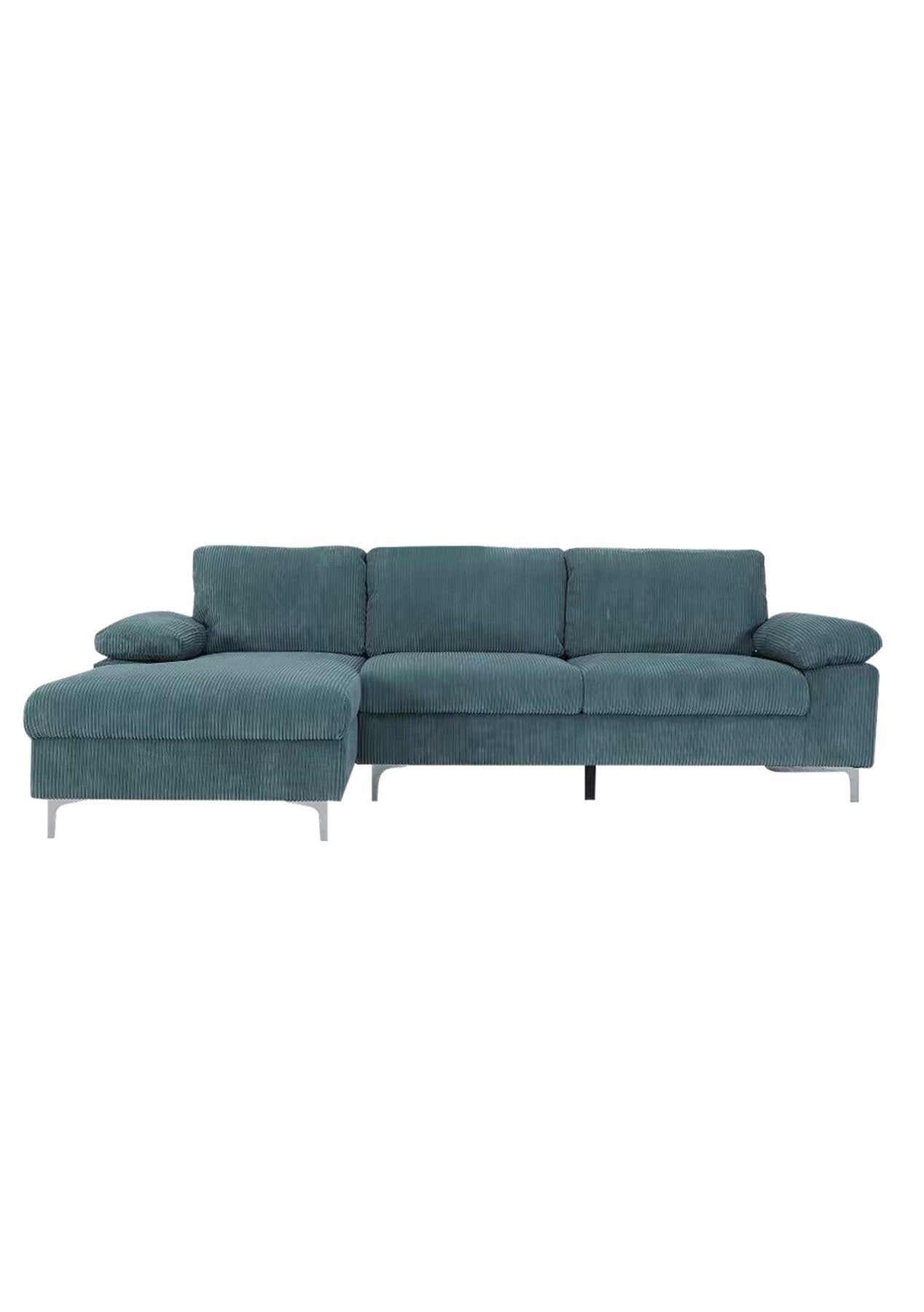 PR65639 Kaveah Corduroy Sectional Sofa GreenThis Kaveah Corduroy Sectional Sofa is a perfect place to lounge, watch TV or relax with family and friends. Constructed with a solid wood frame, filled with premium foams and upholstered in durable corduroy fabric, our sofa is sturdy in every way. The seats are comfortable with soft cushions and ample support for your back too. This inviting design envelops you in a cozy embrace, making you feel instantly at ease and comfortable. Suitable for a variety of space and style, this sofa offers you the ultimate experience and helps the body to fully relax. It will give your home the renaissance it deserves.Note: Actual product colours may vary due to lighting, studio photography, room conditions, or different screens on various devices.FeatherContemporary designLeft chaiseSturdy wood frameWide armrestCorduroy fabricSolid metal legsEasy assembleSpecificationColor: greenDimensions: 261x132x80cmWeight capacity: 500kg It comes in 2 boxes.Packaging Dimensions: BoxA: 173.5x 76.5x 36.5CMBoxB: 93.5x 133.5x 36.5CM