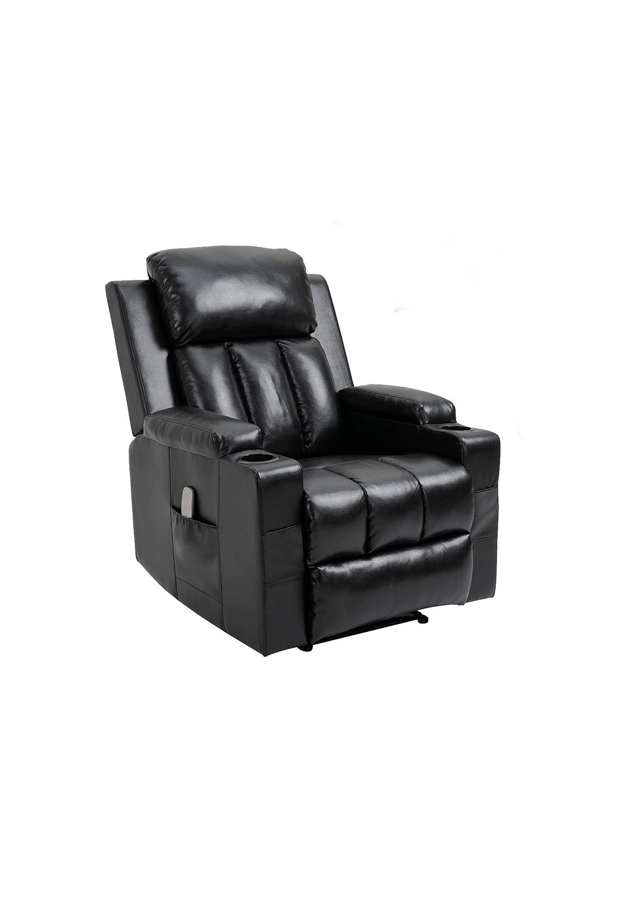 PR8615-Miralin Massage Recliner Chair PU BlackMiralin massage recliner is the perfect choice to eliminate work fatigue and enjoy a good time. It is ergonomically designed with high-density sponge filling, which fits the curve of the human body and can be well supported when sitting or lying down, let you choose to relax and relieve stress while reading, nap or watching TV. This recliner chair comes with 8 areas of massage functions and the backrest can be heated. The lumbar support is ergonomically designed to reduce the user's stress and strain. The tilt angle can be adjusted through the pull ring to ensure a comfortable sitting experience. The skin-friendly and soft leather brings you enjoyment and comfort. It is an essential recliner chair for your home!FeatureSturdy constructionWrapped with PU leatherAdjustable angleHigh density foam8 Vibrating nodesBackrest with heating function2 large side pockets2 cup holdersWireless remote controlSAA approvedEasy assemblySpecificationMaterial: wood + steelColor: blackDimension: 80x98x103cm Package Dimension: Box A 860mm x 540mm x 300mm Box B 760mm x 560mm x 640mm