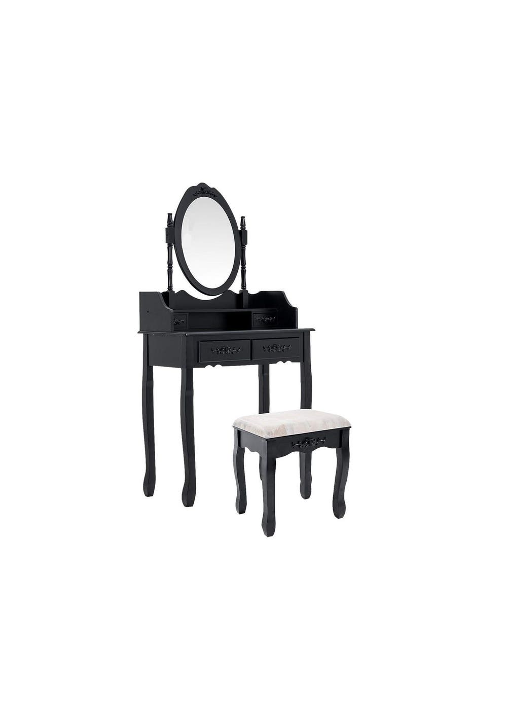 PR8034-Freda Dressing Table Set BlackWith 2 small drawers and 2 grand drawers under the dressing table, Freda Dressing Table Set offer a generous storage space to hold your cosmetics, jewelry, ornaments, hairdressing utensils and other accessories. Made of quality wood and MDF, this sturdy vanity dressing table will meet your long term needs and decorate your home all the time. The large mirror with elegant lines reflects your style before heading out for a date. And the stool has a really comfortable top. When you are sitting on it and dressing yourself, you will feel that it's really an enjoyment. FeaturesFlower-carving vanity table Elegant and modern designMade of wood and MDFSturdy and durable Smooth and spacious table top4 storage drawers Cushioned StoolCurved legs Assembly requiredSpecificationsColor: blackMaterial: MDF + WoodTable size: 80 x 40 x 141 cmStool size: 38 x 28 x 43 cm