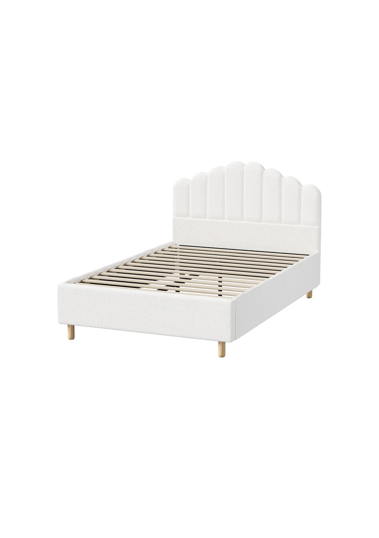 PR65702 Shelley Boucle Bed Double Indulge in Comfort and Style with Our Shelley Boucle BedLuxurious Boucle FabricImmerse yourself in ultimate comfort and style with the soft-to-the-touch boucle fabric upholstery that envelops the entire bed frame, creating a cozy and intimate atmosphere for your restful sleep.Sturdy ConstructionBuilt from pine wood with high-density foam padding and rubber wood legs, this bed frame is designed for durability. Sturdy wooden slats provide comprehensive mattress support and ensure a significant weight capacity.Unique Cascading Bedhead Design Introduce a touch of classic elegance and contemporary flair to your bedroom decor with the unique cascading bedhead design, creating a stylish focal point that distinguishes this bed.Features:Materials: pine wood frame, polyester boucl upholstery, high-density foam padding, rubberwood legsCosy boucl fabric upholstery covers the bed frame from head to endSolid wood reinforced slatsSturdy rubber wood legsEasy maintenance and cleaningEasy assemblyBed frame material: boucl fabricSlats material: PlywoodLeg material: Rubber woodOverall dimensions:Double: 197cm x 138cm x 114cmColour: whiteAssembly required: YesNumber of packages: 2Shelley Boucle Bed Double x1Assembly Instructions x1
