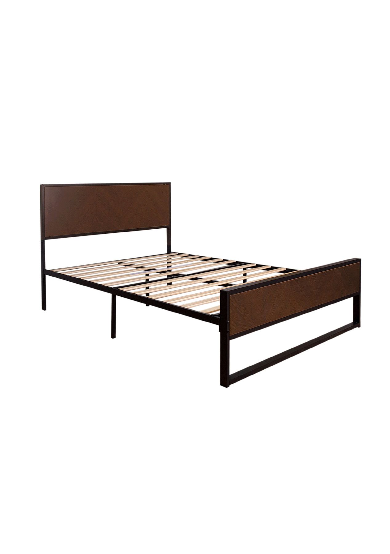 Product ID: PR65213 Fraser Bed Frame Queen WalnutThis rustic Fraser bed completes your industrial decor with a mix of materials and an open design. It's made from a mix of metal and engineered wood, and has a two-tone brown and black finish for a light industrial look. A rectangular headboard and matching footboard bring a touch of accent by showcasing the carved herringbone pattern through a puzzle wood grain. There's also lots of room underneath to tuck away boxes and bins. Stylish yet practical, this Fraser bed will meet your taste. ==Specification==* Material: metal frame with powder coated + MDF+ plywood slat* Overall size: 213(L)x154(W)x108/50(H)cm* Head board: 108cm height; Side rail: 35cm height; Foot Board: 50cm height* Inner frame size: 205x153cm, wooden slats x12* Size: Queen, fits for mattress: 154*205cm* Color: Walnut* Weight capacity: 350KGS
