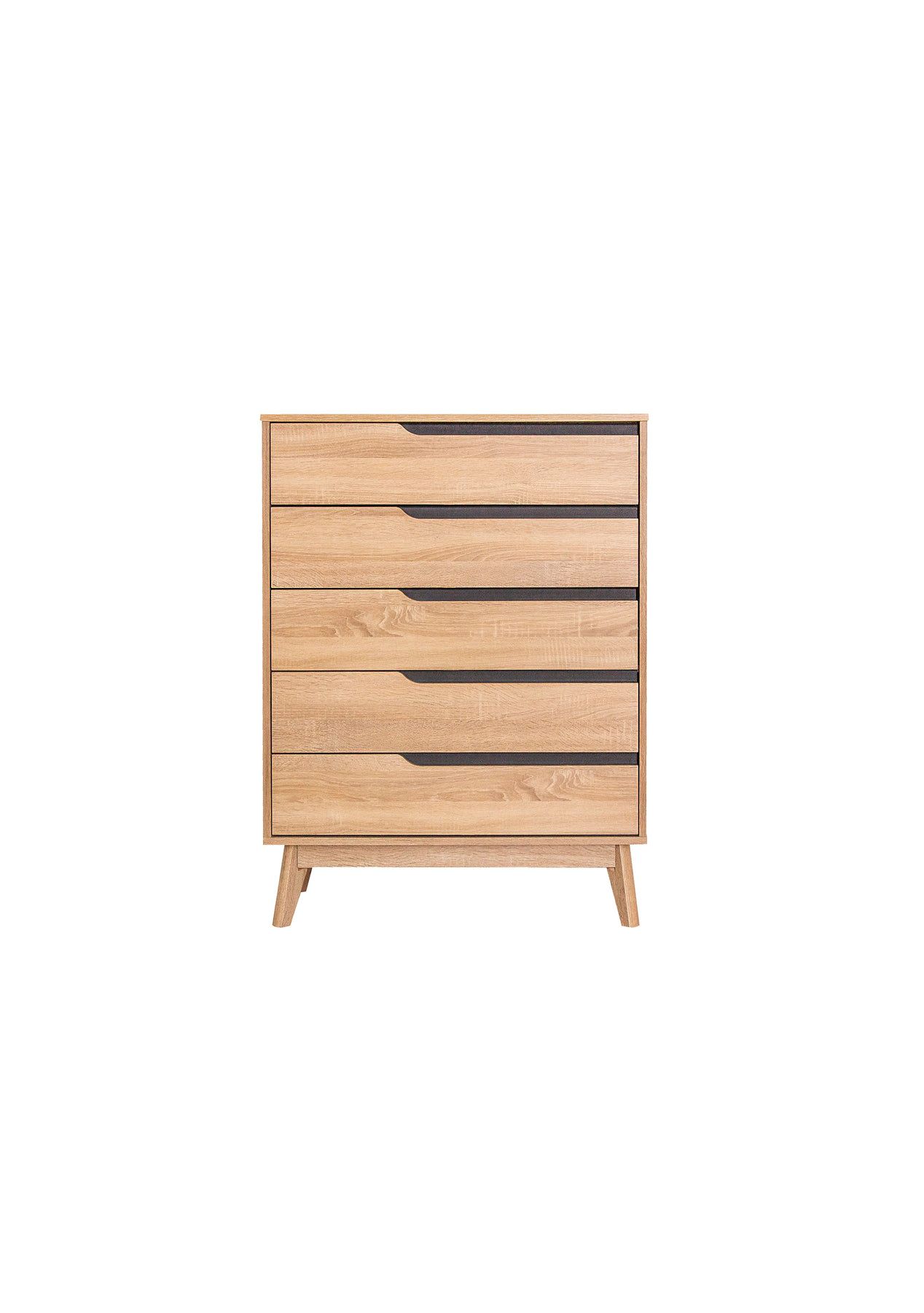 PR1984- Fella Chest of 5 Drawers Our newest Fella collection brings elegance and art to your home and living areas. Great quality, brand new Chest of 5x Drawers, made with Hana oak and finished with elegant legs. Product Description/Specification - Hana Oak Colour- Product size: L804 X W404 X H1074mm- 5x Runner Drawer's Storage Space *While you are at it, check out the other Fella collection from our store. We supply the matching Bedside Table, Dressing Table with Mirror, Storage Cabinet with Mirror and Writing desk!