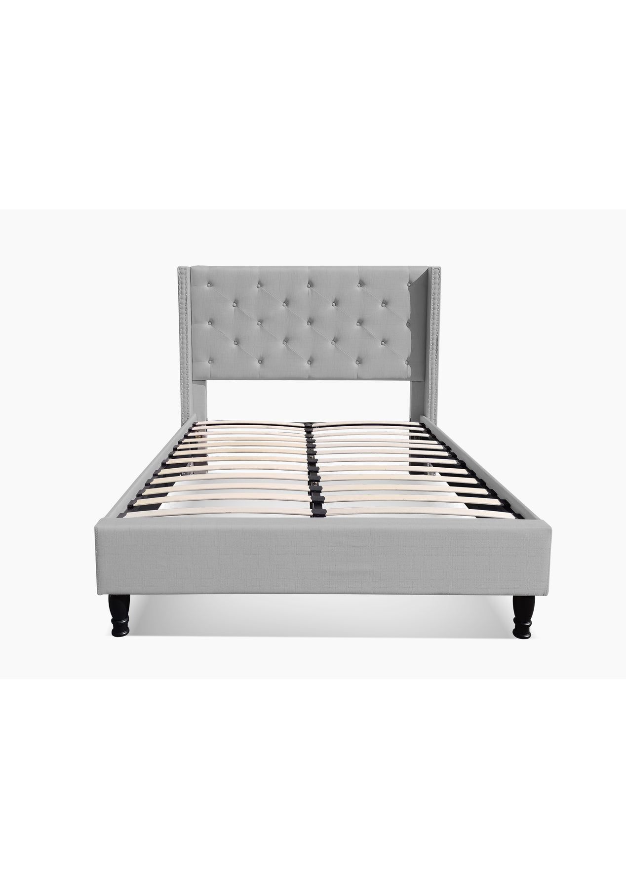 PR10155 New Lisbeth Fabric Bed Frame Double Grey Your good mattress certainly deserves an equally fine bed frame. This new luxurious fabric Lisbeth bed frame will give your room an elegant touch of style. The bed comes with a dashing tufted headboard that also includes metal studded detailing on the sides of the bed that gives a modern twist to the classy design. It features a curved slat base providing a great degree of comfort. The natural bounce on the slats adjusts to your sleeping profile. Surely it will provide anyone with a restful night.This listing is for the Bed frame only. Mattress NOT included.FeaturesElegant designUpholstered in quality fabricTasteful tufted headboard detailingClassy studs on headboard sidesWooden flexi slatsFits a standard Double MattressSpecificationColor: GreyOverall size: 208x157x129cmHeadboard height: 129cmFootboard height: 38.5cmSimple assembly requiredWeight Limit including Mattress - 250kg It comes in 2 boxes.Packaging Dimensions: BoxA: 148x73x10.5CMBoxB: 199x25x17.5CM
