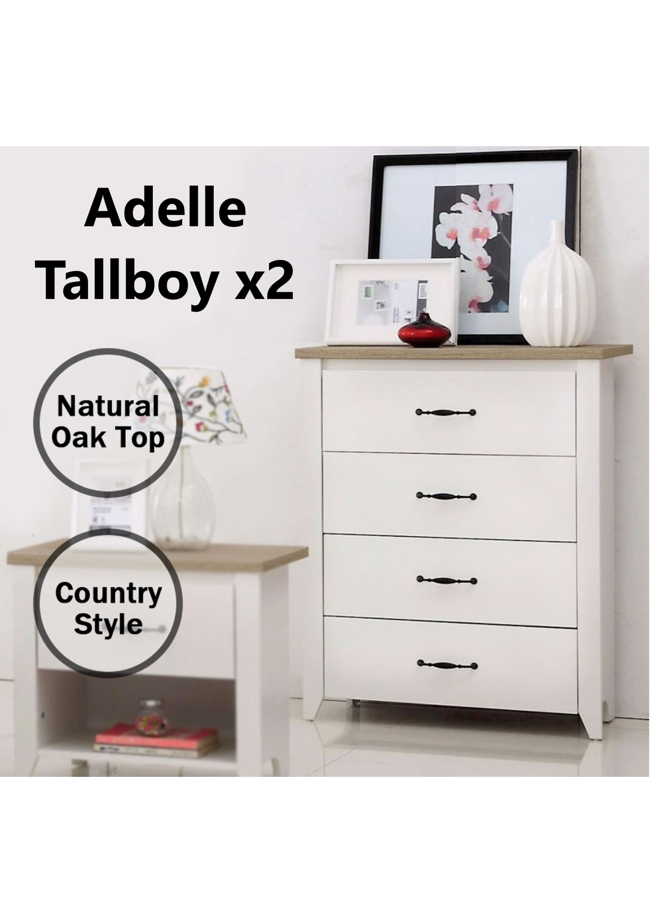 PR8334 - Adelle Tallboy x2The country-style Adelle bedroom collection is the perfect choice for your bed room. The stunning contrast between natural oak color top and white body is the hallmark for Adelle. A perfect range for the latest country style at low price.You are bidding on an Adelle 4 drawers tallboyFeaturesLatest Country StyleNatural Oak top contrast with white bodyQuality engineered wood with wood grain melamine finish4 Drawers with black vintage look handleSturdy constructionDimension: W73 x D39 x H99.5 cmAssembly required