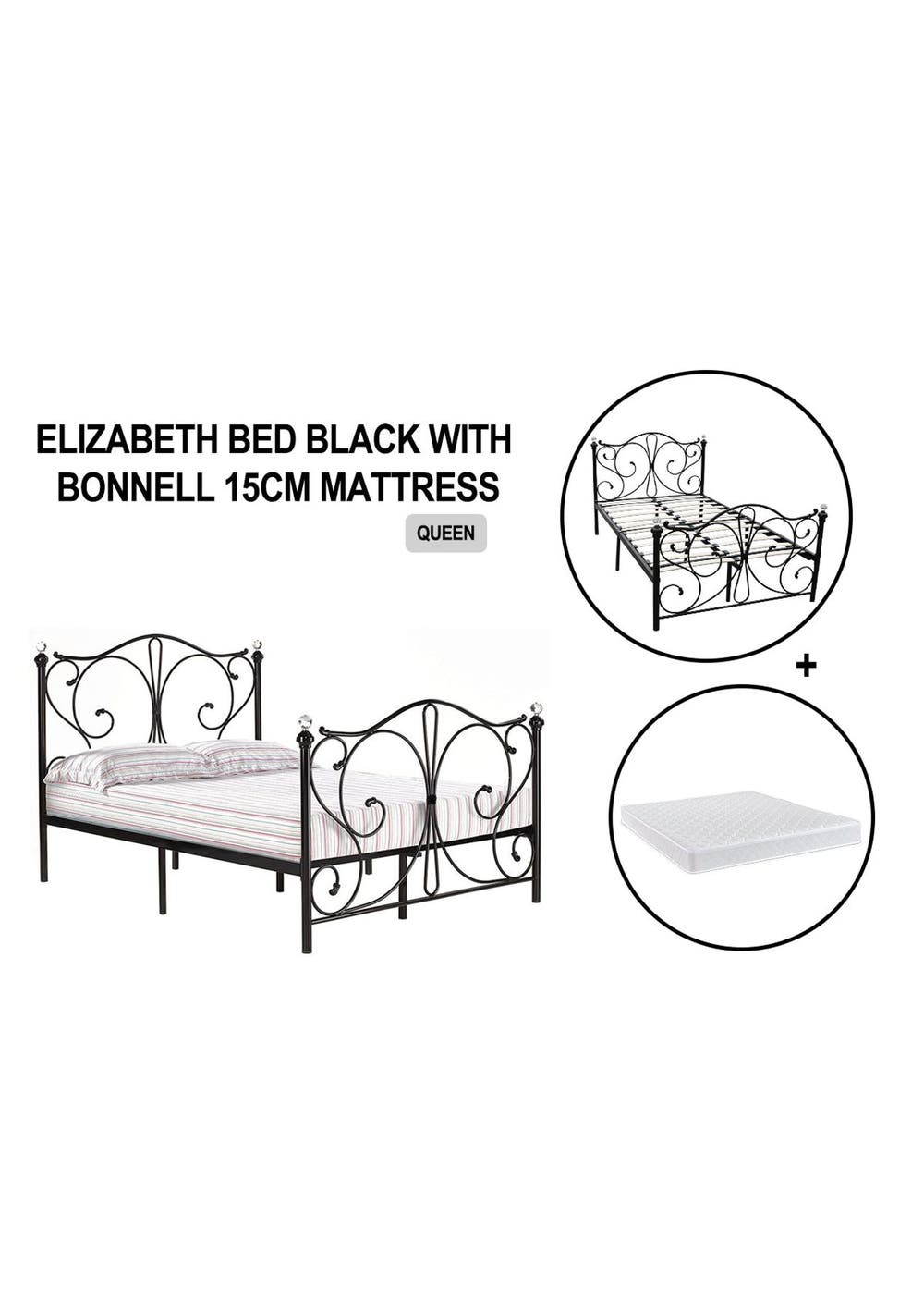Please note that this exact mattress size may not be on display; However, a different size of the same model may be available for you to try. PR8660- T Elizabeth Bed Queen Black with Bon15 Queen Mattress ComboPR2044 (2)- Elizabeth Bed Queen Black Add a touch of elegance to your bedroom with this Elizabeth Metal bed. The headboard and footboard boast traditional scrollwork curves with round finish posts to provide a simple, yet classic look. Sturdy powder-coated steel frame, across the frame, the bed includes wooden slats and supporting legs for added support and comfort. Designed to fit a standard queen mattress effortlessly, our Metal Bed is guaranteed to give you pleasant dreams with every sleep.Feature:Elegance Elizabeth styleSturdy metal frame constructionRust-resistant powder-coated finishSlatted base with multiple support legsFits a standard queen mattressOverall dimension: 2106 x 1606x1080 mmColor: BlackProduct ID: PR2841 (3)- Queen Bon15 Mattress/ Bonnell Spring - 15cmIf you are looking for an economical option for a mattress for your own bedroom, guest room or for home staging, this is the perfect opportunity to get a quality mattress at a bargain price. This Queen Mattress comes with continuous bonnell spring construction with 15cm overall thickness. This mattress will give you the comfort of a conventional inner-sprung mattress, but at the same time offer you back support.Features:Queen Mattress 15cm thickness MattressGood quality Bonnell springs Queen Mattress Queen Mattress Ideal for light bed frames and shallow fitted sheetsHigh-density foam Queen Mattress Soft quilting layer Queen Mattress Hypo-allergenic material Queen MattressMedium firmness (note that the firmness rating may vary on different people's standard)Queen Mattress Dimension: L 203cm x W 153cm x H 15cmIt comes in 2 boxes.packaging Dimensions: BoxA: 162x118x9CMboxB: 158x28x28CM