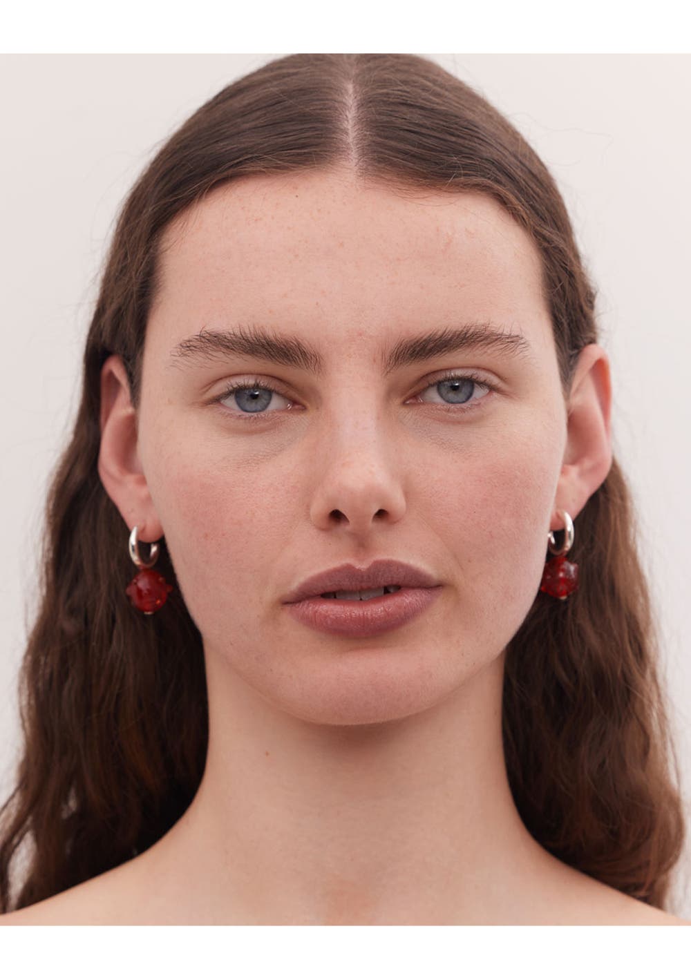 A textural glass sphere suspended from a tubular hoop, orbiting the earlobe like its own little planet. At once minimal and dramatic, strange and elegant — a piece that exemplifies our love of pushing and playing with the limits of creative tension. As each glass piece is handmade there will be size and colour variations between every piece.