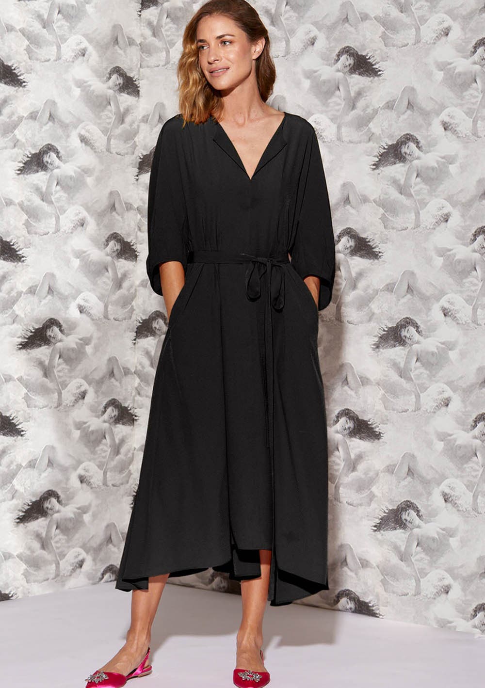 True fit, order your usual size Round neck with tunic style deep V opening Separate tie with belt loops Pockets Elbow length sleeves Relaxed fit Soft crepe style fabric feel no stretch Knee or below knee length depending on your height Shoulder to hem approx 121cm (Size 12) 100% viscose Cold gentle hand wash Designed in Australia Made in China