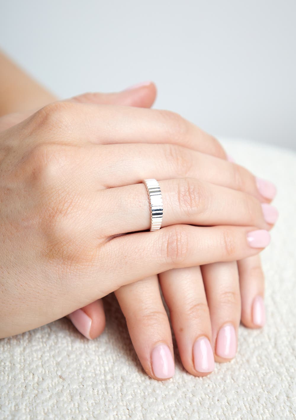 This elegant ring is on trend and has a fancy ribbed effect. A versatile piece to mix and match. Crafted in genuine sterling silver, it is a must have. Comes with an Curated Fine gift pouch