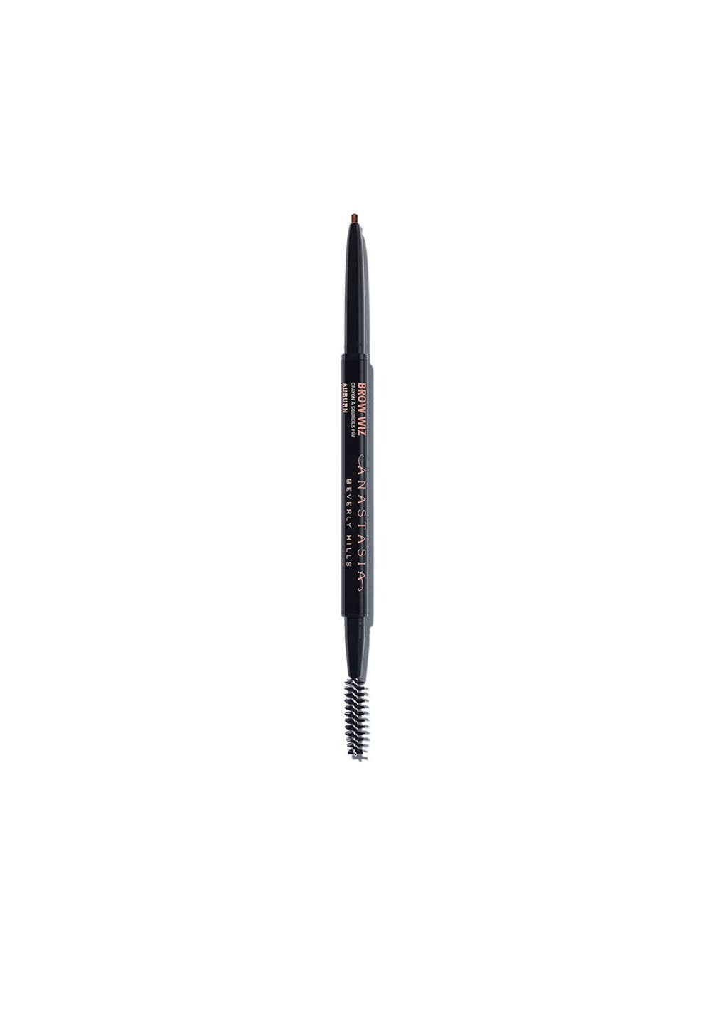Anastasia Beverly Hills Brow Wiz® is an ultra-slim, retractable eyebrow pencil that is designed to add definition and hair-like detail to the eyebrow with maximum precision and control. The unique wax formula features a perfect blend of eyebrow color and wax to deliver a high color payoff and mimics the look of hair-like texture for a natural-looking eyebrow. The ultra-fine, 1mm tip creates hair-like strokes in sparse areas of the eyebrow, while the custom spoolie brush blends for a natural-looking finish.