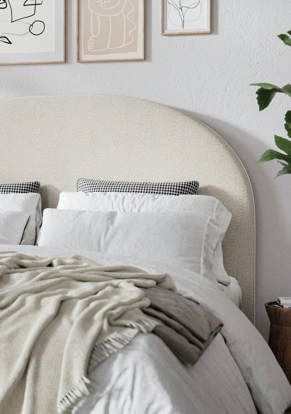 Upholstered in soft textural boucle fabric, this headboard is the perfect feature for your bedroom. The on-trend design in a natural colour that pairs back beautifully with any bedding.