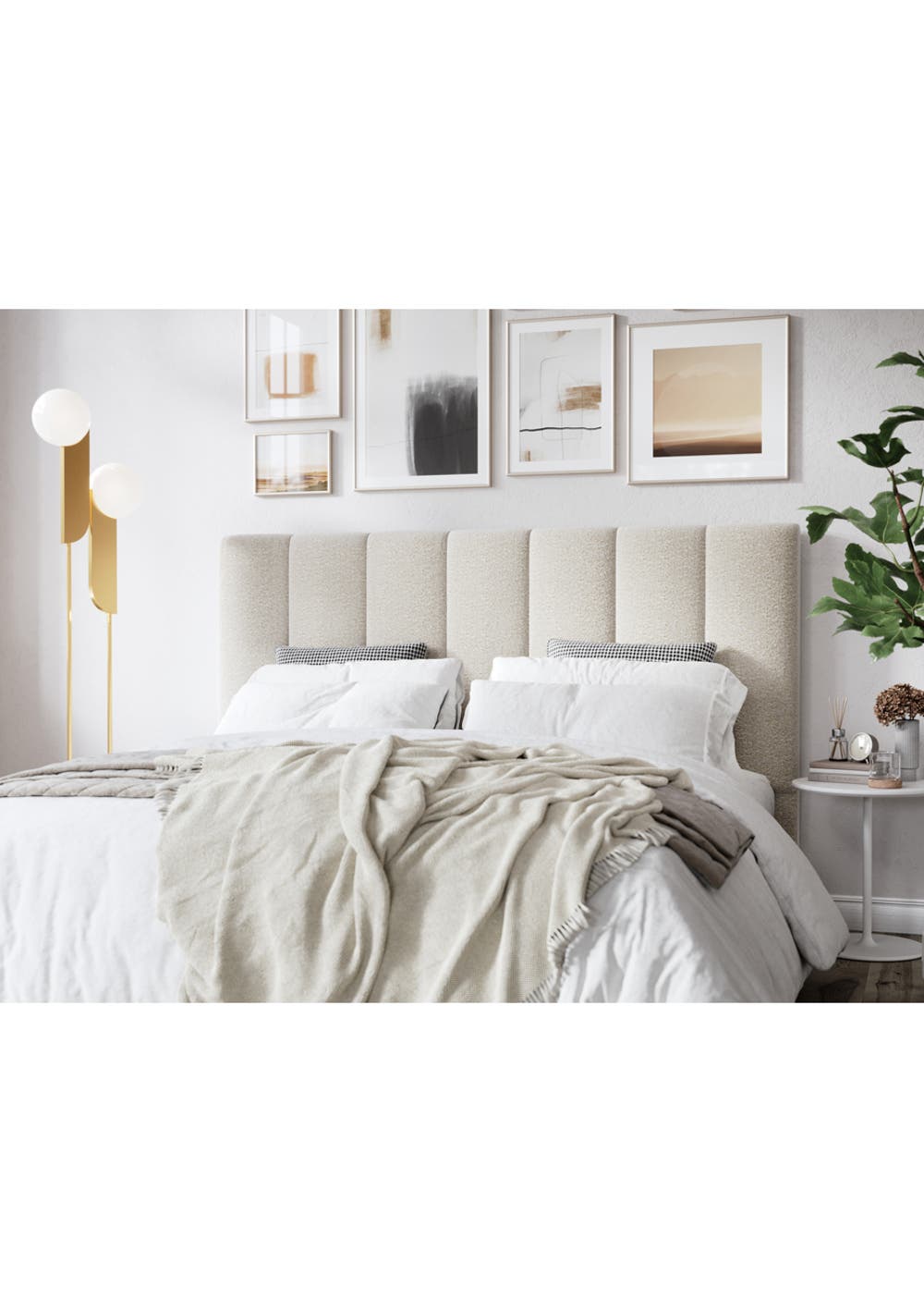 Upholstered in soft textural boucle fabric, this headboard is the perfect feature for your bedroom. The on-trend design in a natural colour that pairs back beautifully with any bedding.