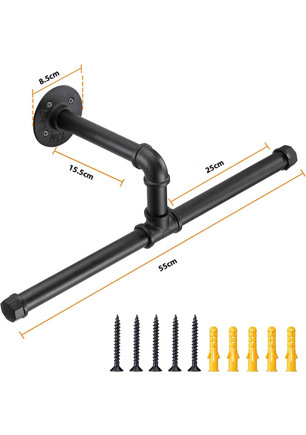 Floating Clothing Rack Wall Mounted<br><br>Material: Black Matte iron<br>Product overall dimensions: 55x17.5x19cm<br>Package dimensions: 30X15X 6CM<br>Net Weight: 900g<br><br>Features<br><br>• 【Premium Industrial Design】: This garment rack is designed with high-quality iron pipe, sporting a modern look. The combination of durability and style makes it a perfect addition to your home, office, or retail space.<br>• 【Black Matte Surface】: The product features a black matte surface finish, lending an elegant touch to its robust industrial design.<br>• 【Space-Saving Solution】: This wall-mounted rack is a perfect solution for organizing your clothes, thereby making your space more comfortable and organized. It's ideal for displaying clothing, drying laundry, or expanding your closet rod storage capacity.<br>• 【Sturdy & Durable】: Made of heavy-duty iron pipes, this closet rod is designed to be installed on solid walls, ensuring extreme durability. The package includes hardware to mount on concrete, tile walls, or other types of walls.<br>• 【Multi-Purpose Use】: Whether being used to organize your clothing in your laundry room, living room, garden, closet, bedroom, or to stylishly display merchandise in a retail store, this wall-mounted rack is sure to impress. It offers ample storage space for hanging clothes, scarves, belts, and neckties, keeping your belongings organized.<br><br><br>Package Includes:<br>Packing including :<br>2 x Cast Iron Industrial Pipe -25cm<br>1 x Cast Iron Industrial Pipe -8cm<br>1 x Cast Iron Industrial Pipe -15cm<br>1 x 90 Degree Elbow Connector<br>1 x Cast Iron Floor Flange<br>1 x Cast Iron Tee<br>2 x Cast Iron Pipe Cap<br>1 x Screws Set<br>