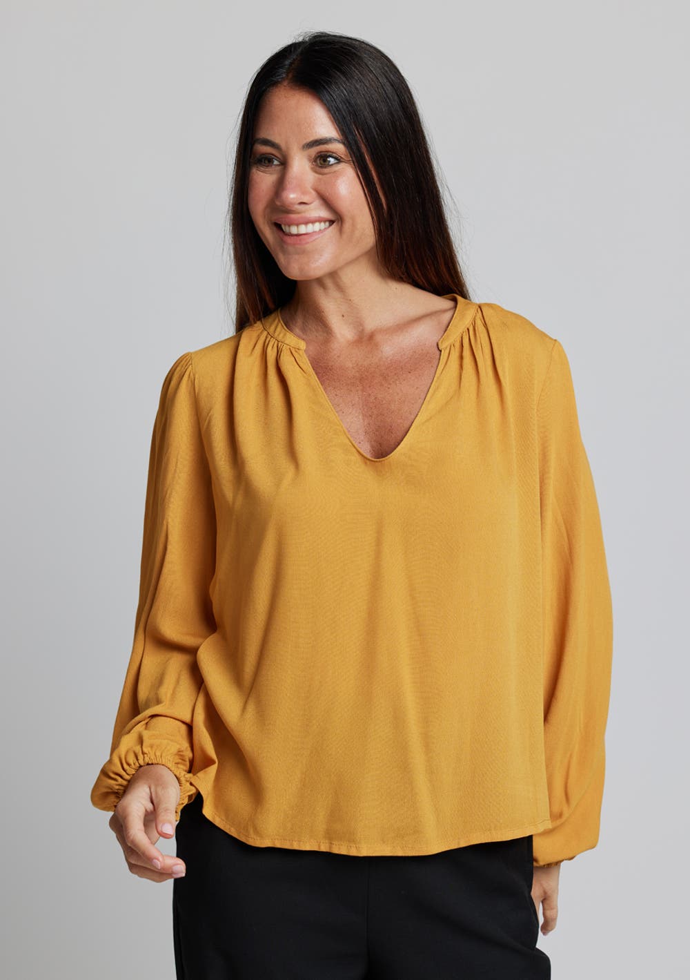 Gathered sleeve blouse with relaxed soft v neckline shaping. 100% VISCOSE