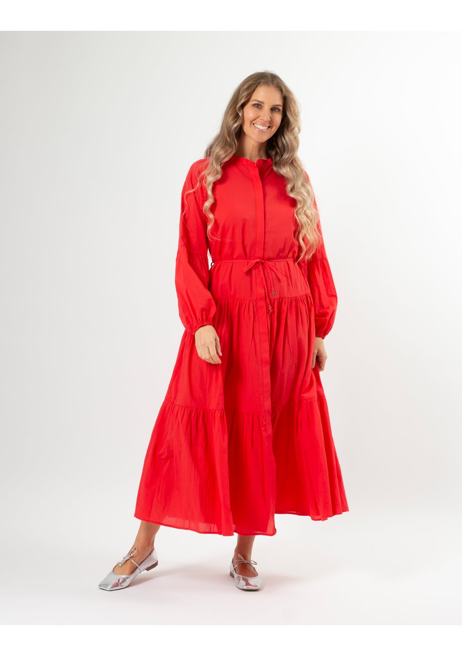 Mandarin collar crew neck dress with tiered panel seams on sleeves and body ,ladder stitch insert on raglan armhole seams, concealed placket detail at front and self fabric ties with gold logo pendants