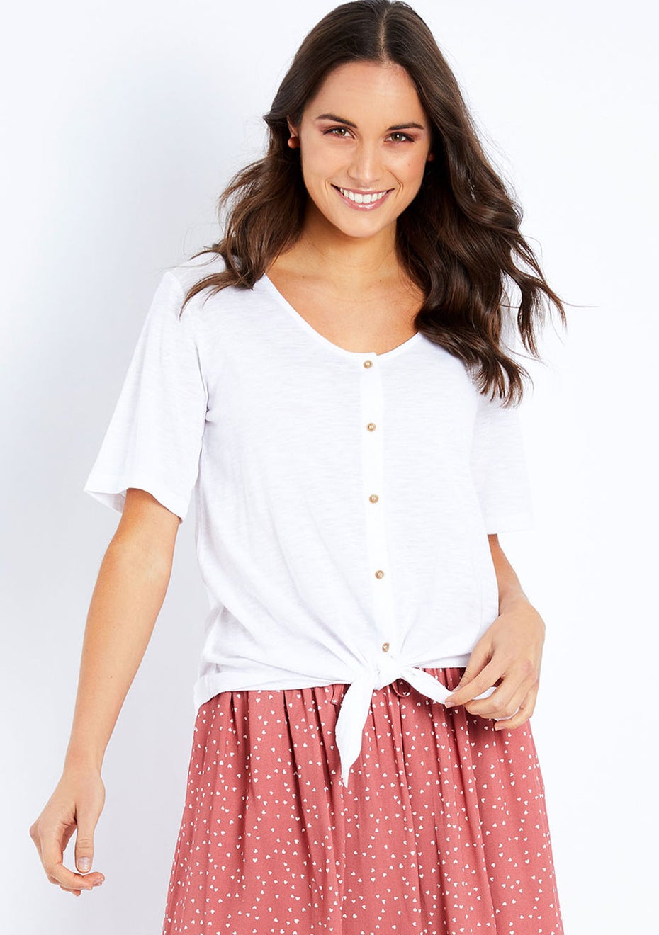 Elevate your basic tops with the San Jose Tee featuring a figure flattering placket down the front finishing off with a knot that cinches in your waist. This style is this season's wardrobe hero.