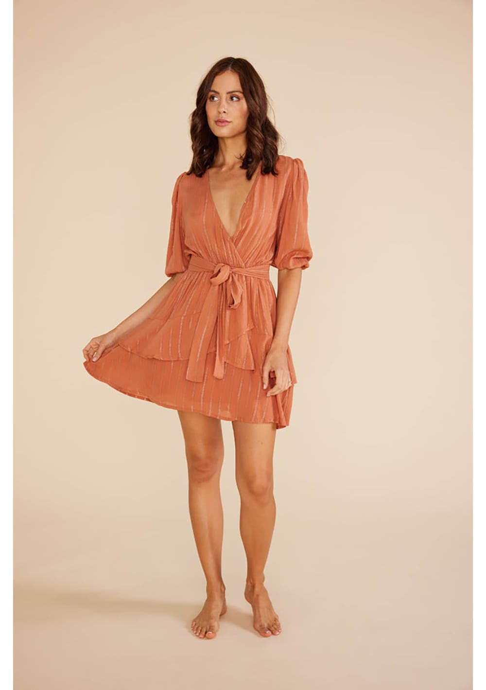 The Kaia Mini Dress is your go-to event wear dress. Featuring gold lurex throughout, this style has a wrap-like bodice and tiered skirt.