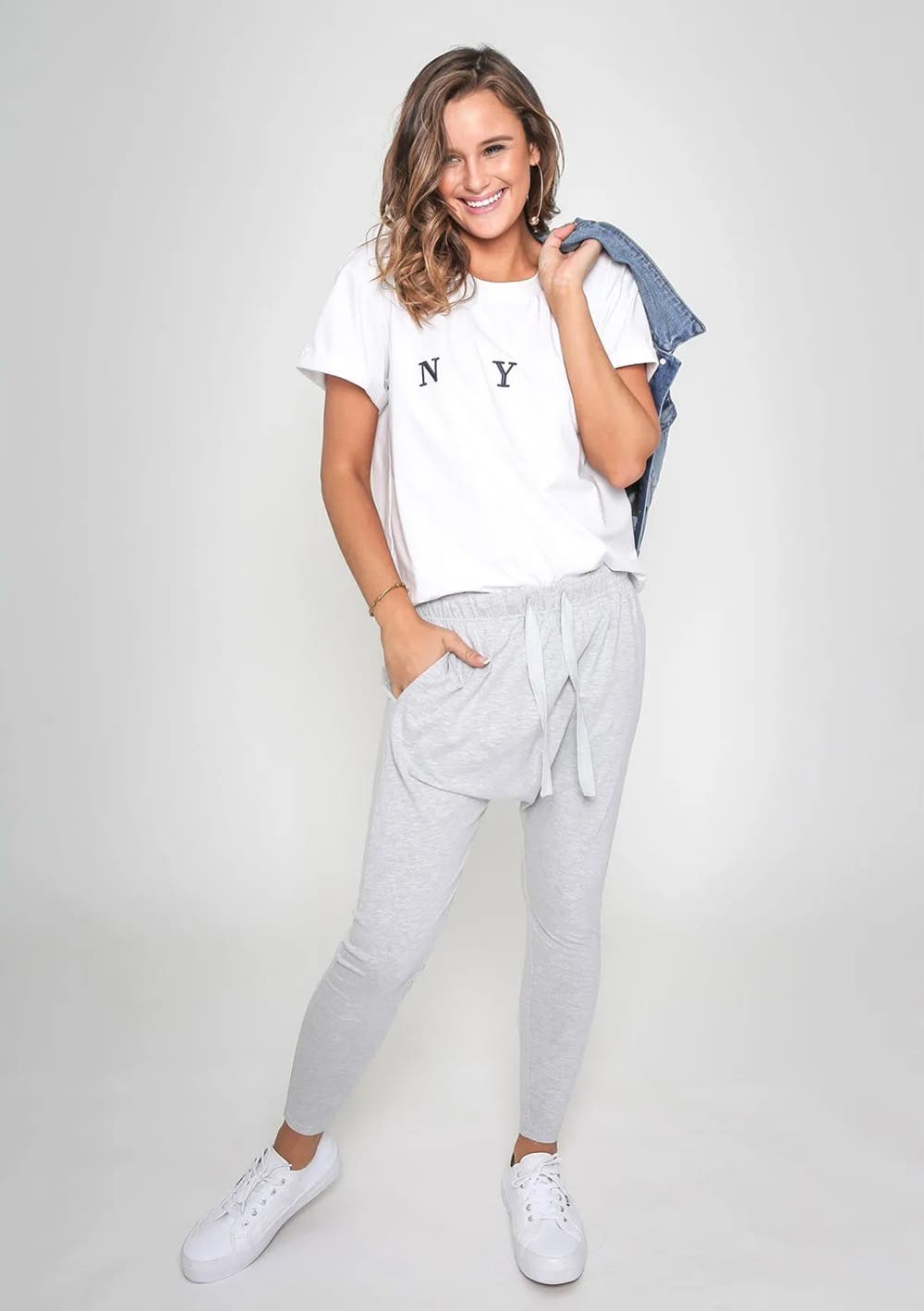 Elastic waist Drop crotch Fitted leg Pockets Tie waistband 95% Cotton, 5% Elastane