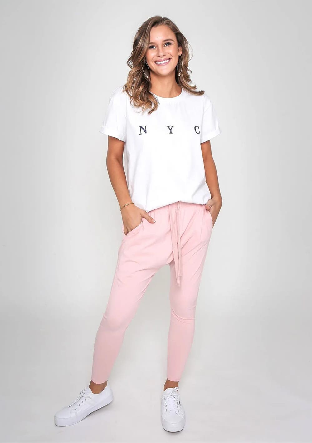 Elastic waist Drop crotch Fitted leg Pockets Tie waistband 95% Cotton, 5% Elastane