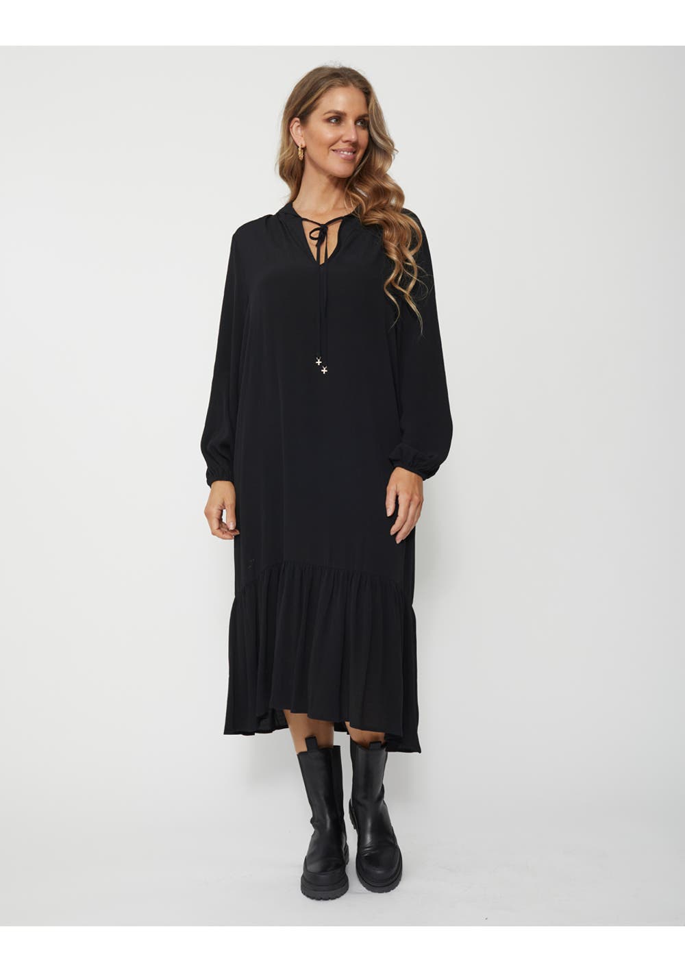 Hooded relaxed fit dress with v neck & gathered hem tier. 100% VISCOSE