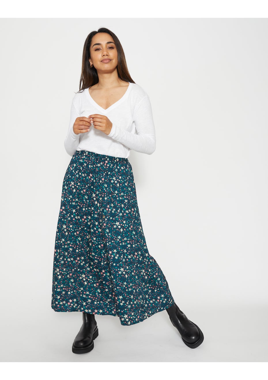 100% Viscose. A-Line midi skirt with self fabric tie waist detail.