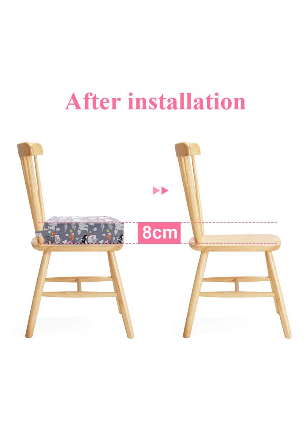 Comes with two straps so you can secure it under the chair and around the back. And it won't slip or slide around and fits most of dining chairs, and it not only ensuring the safety of your kids but also helping them enjoy their meal