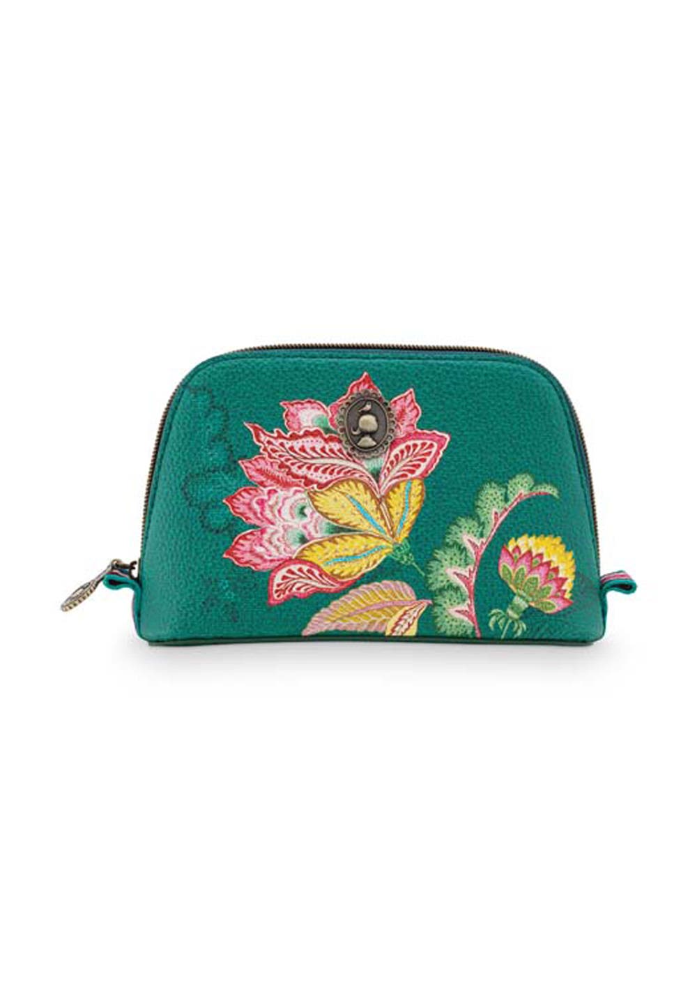 Inside pocket with zipperThis green toiletry bag is made of water-repellent faux leather that is fully printed with the Jambo Flower design. This small size has a brass zipper, a zip pocket on the inside and is decorated with an Pip emblem.
