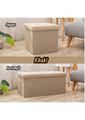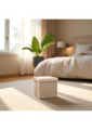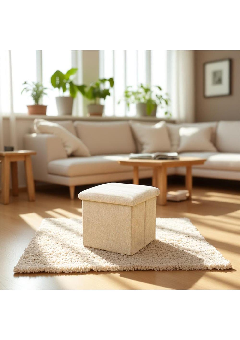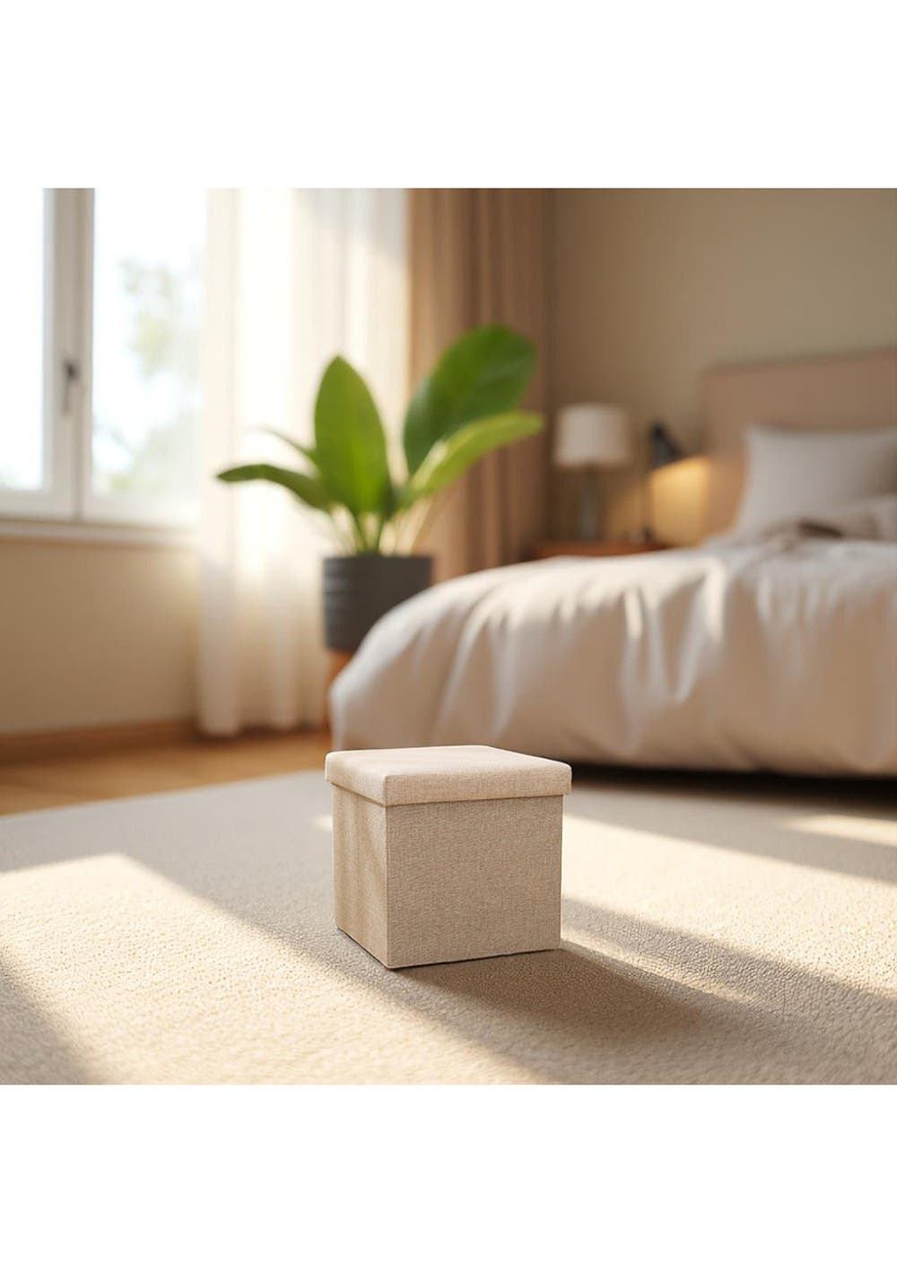 This beige folding ottoman features a square cube design that offers both seating and hidden storage. Ideal for modern living spaces with limited room, the unit combines comfort and function in one foldable structure.