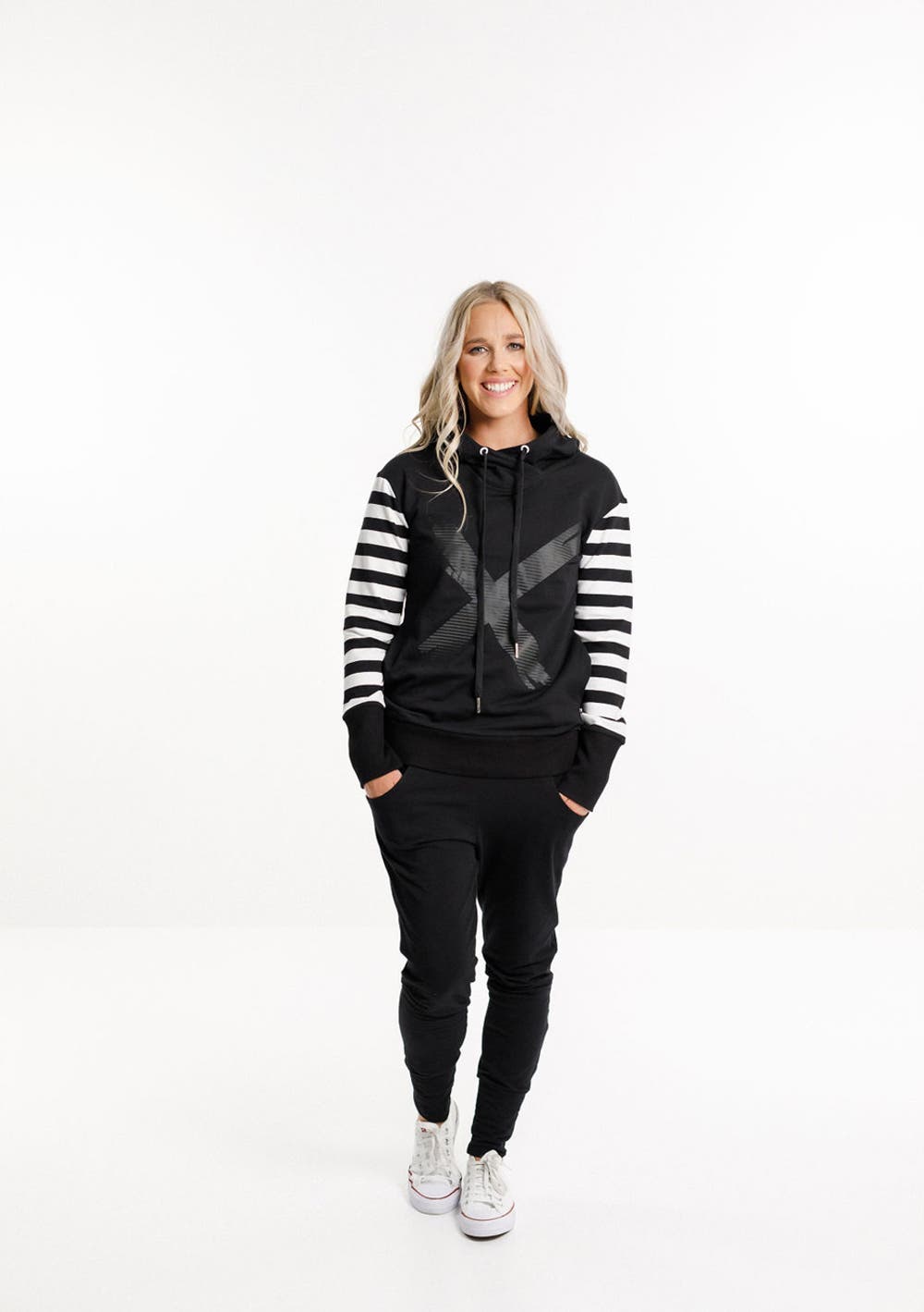 Homelee - Hooded Sweatshirt - Black With Black & White Stripe Sleeves And X Print